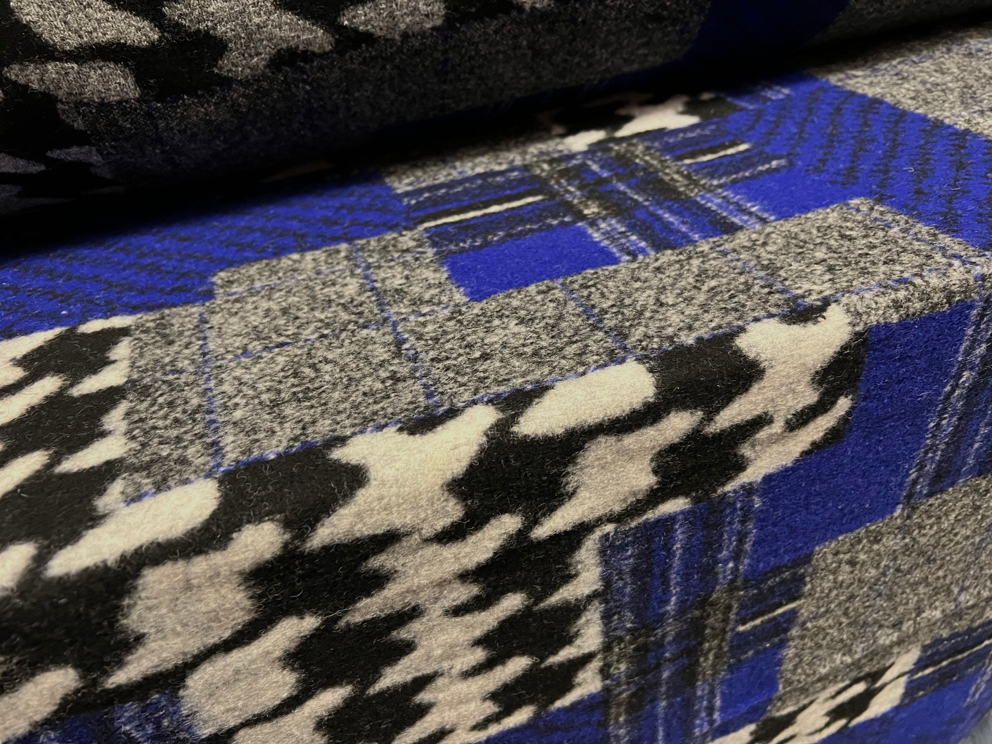 Montana - Wool mouflon flannel fabric, per metre - jumbo houndstooth patchwork design - blue & black