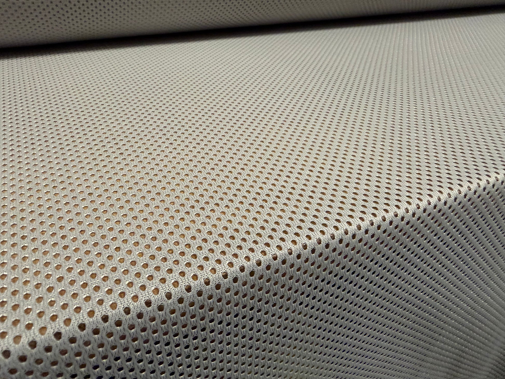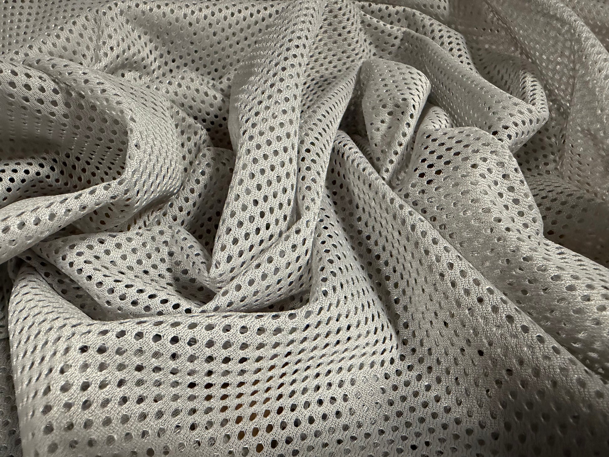 Plain airtex mesh jersey eyelet fabric. Can be used for sportswear, dancewear, fashion and lots more besides. Polyester with minimal stretch. Width 150 cms. Weight 135 gsm.
