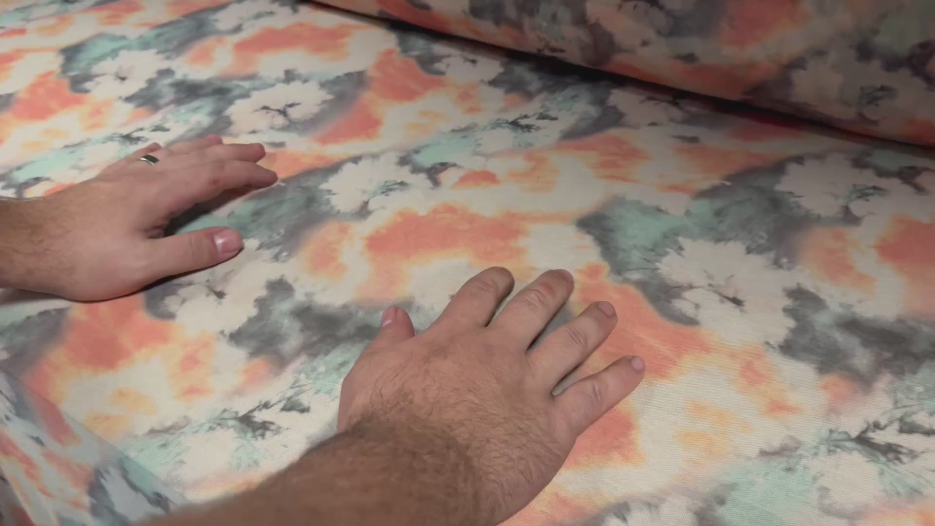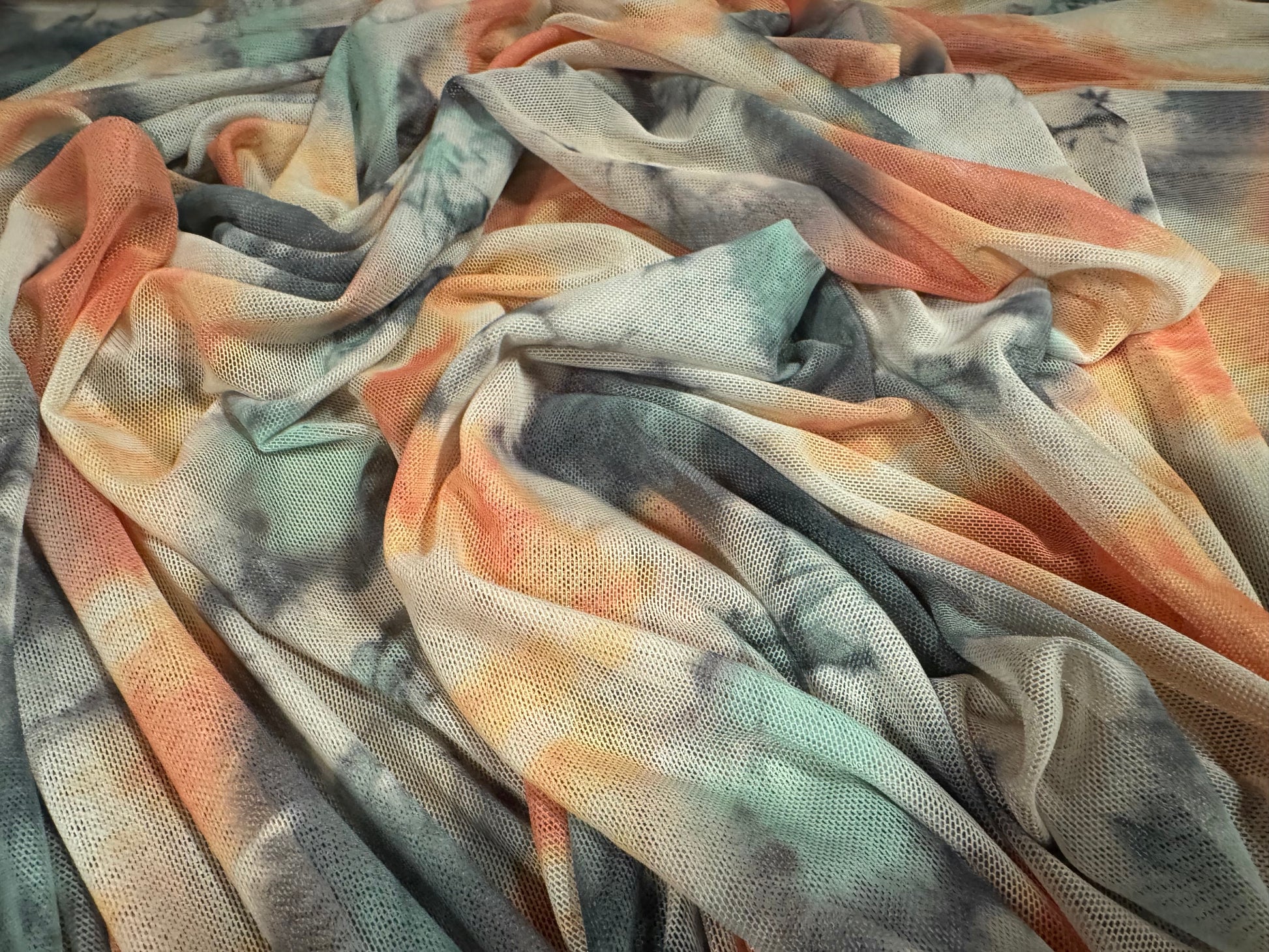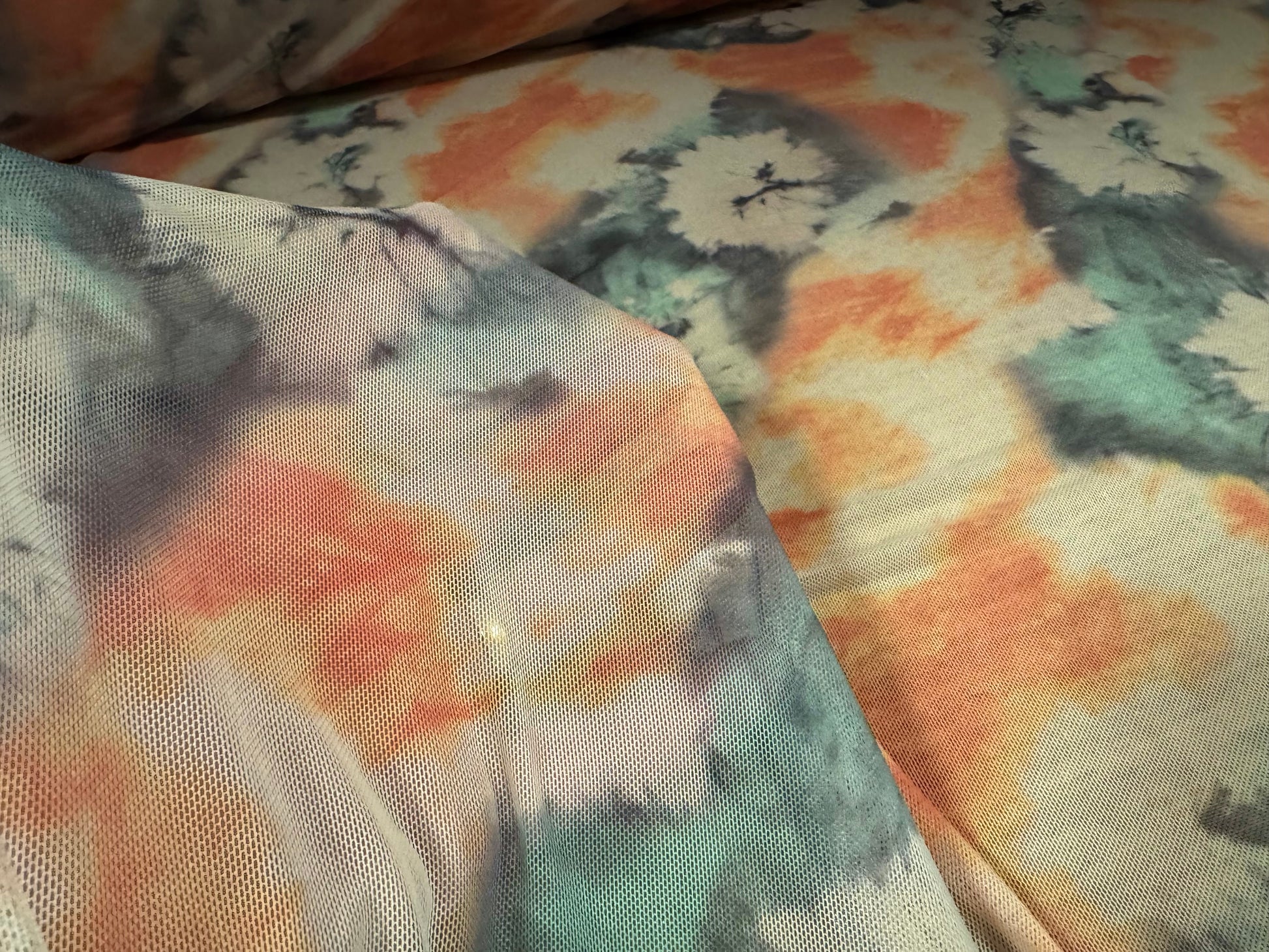 Power mesh net stretch spandex fabric, per metre - smudge floral print - peach & teal