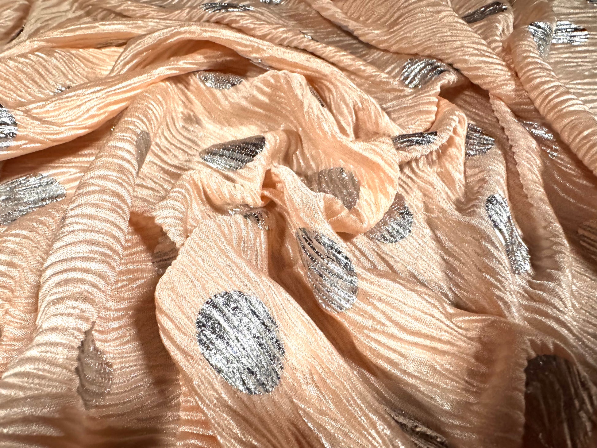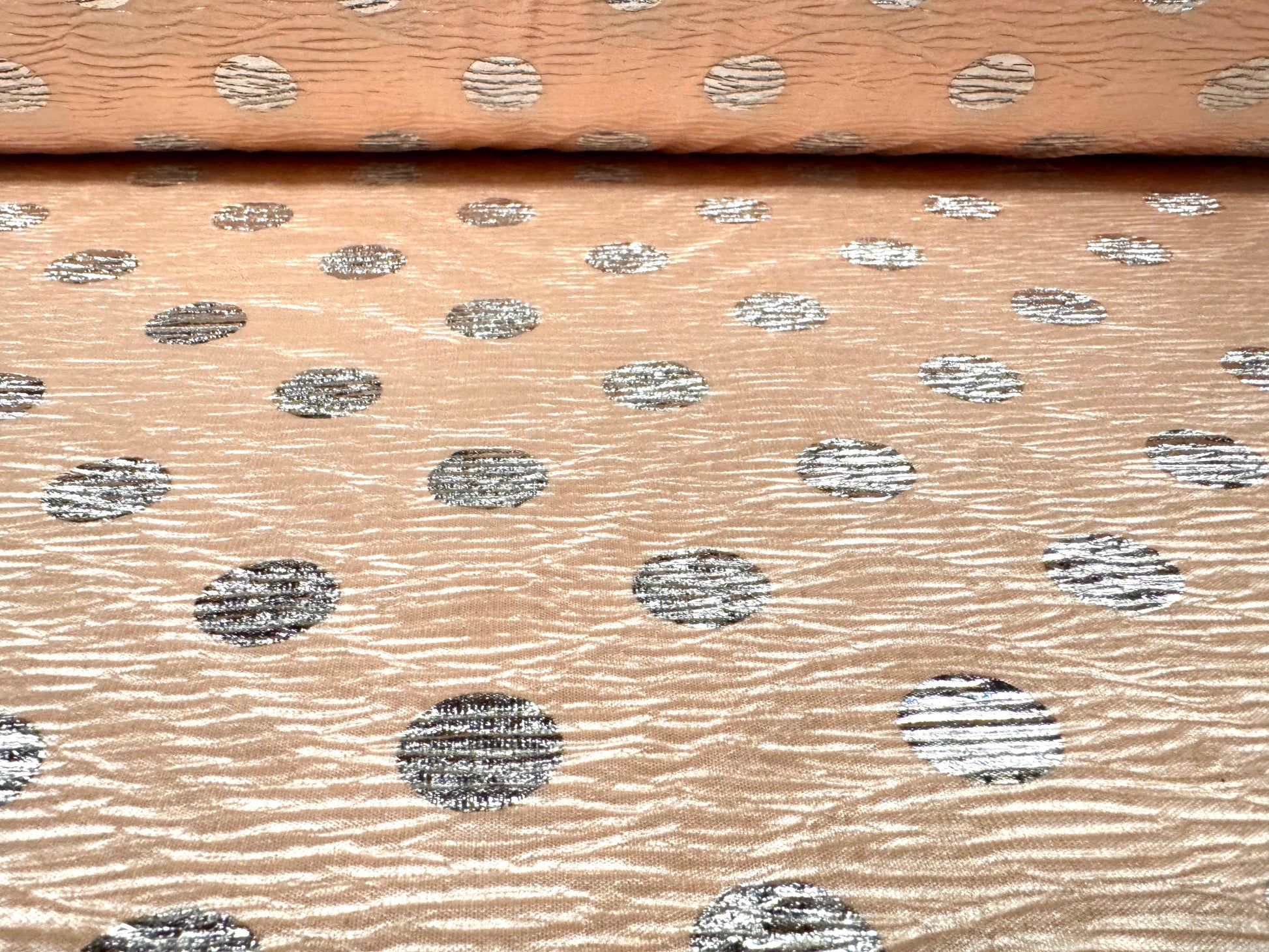 Bodre satin jersey fabric, per metre - blush pink with 25mm silver metallic polka dot print. Width 150 cms. Polyester with a minimum amount of stretch.