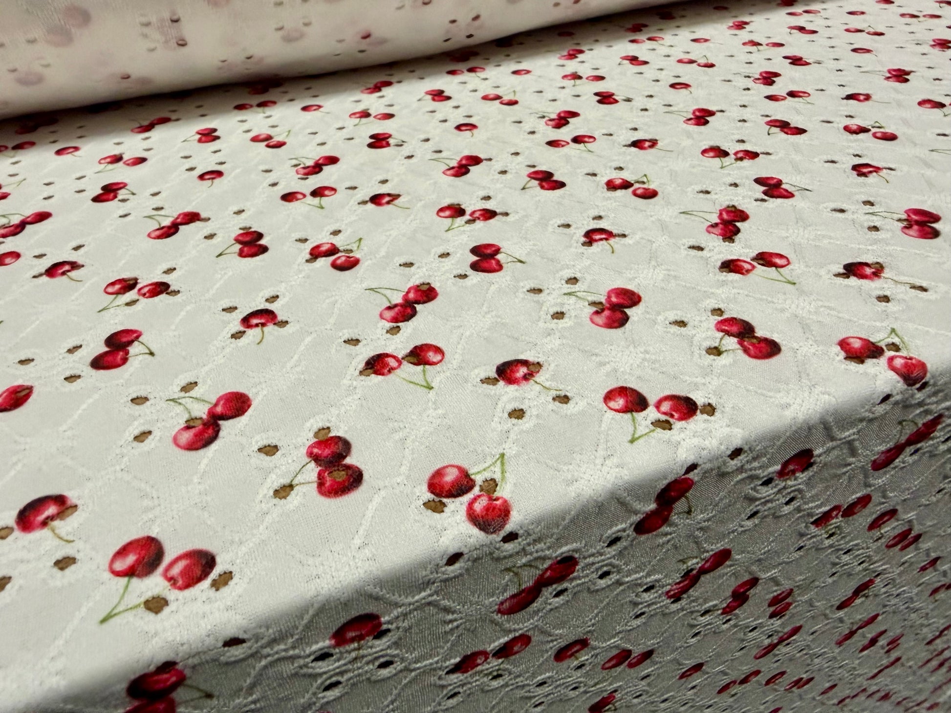 Broderie anglaise stretch spandex jersey fabric, per metre - cherry print - ivory & cerise