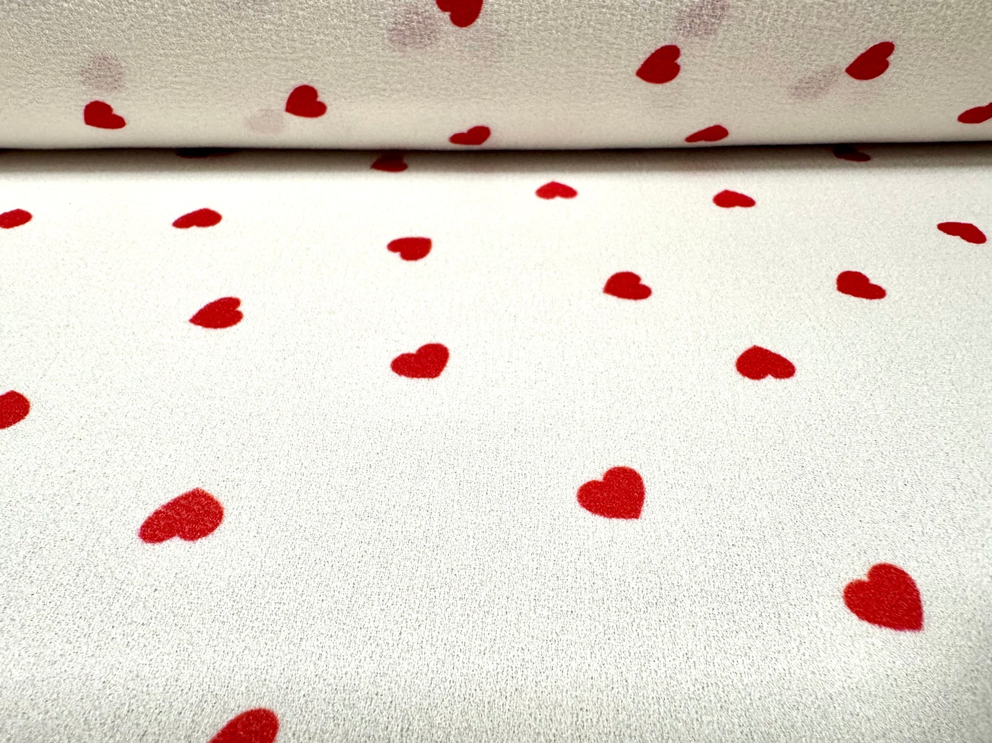 Bubble crepe woven dress fabric with comfort stretch, per metre - love heart print - ivory & red