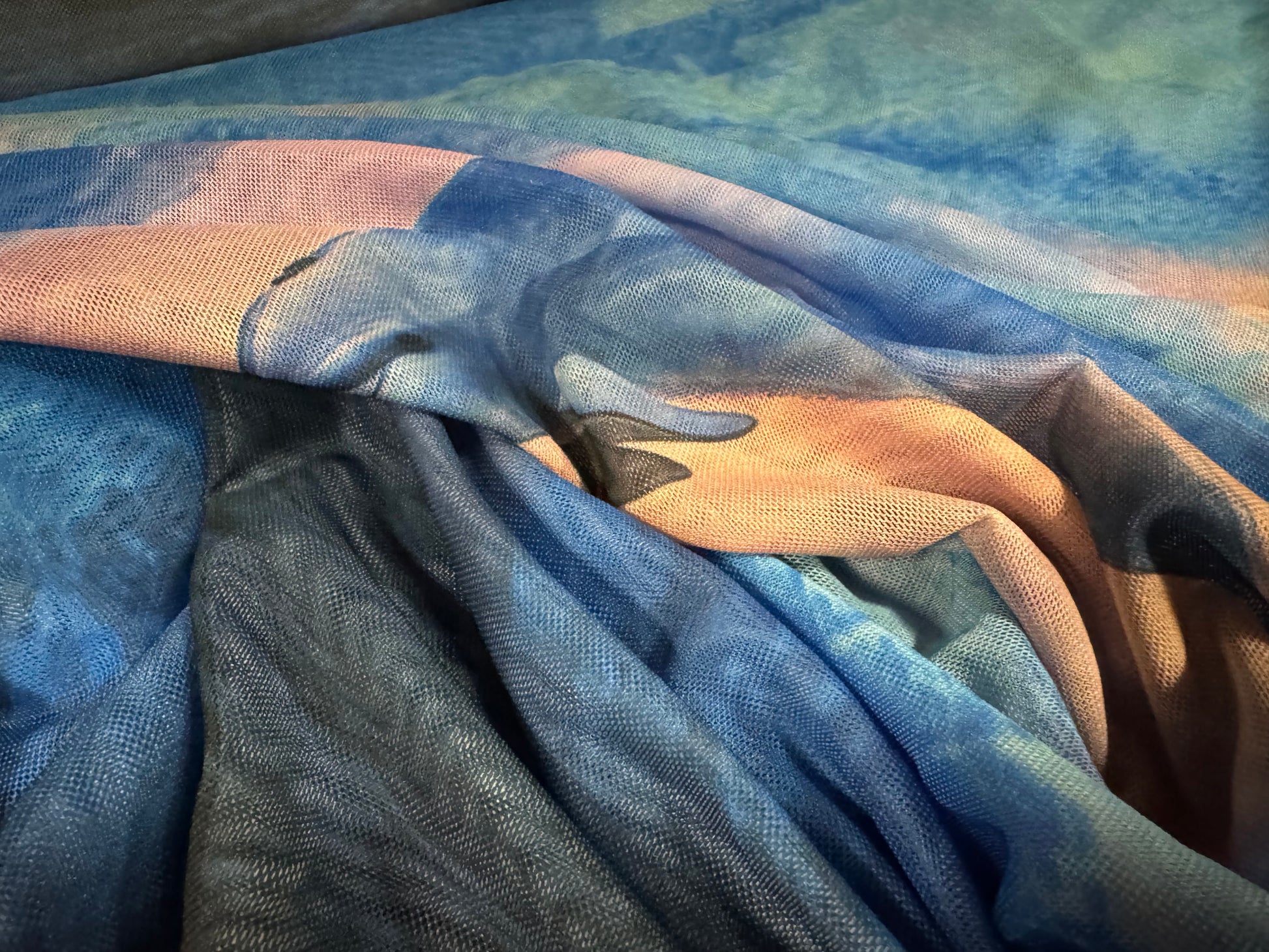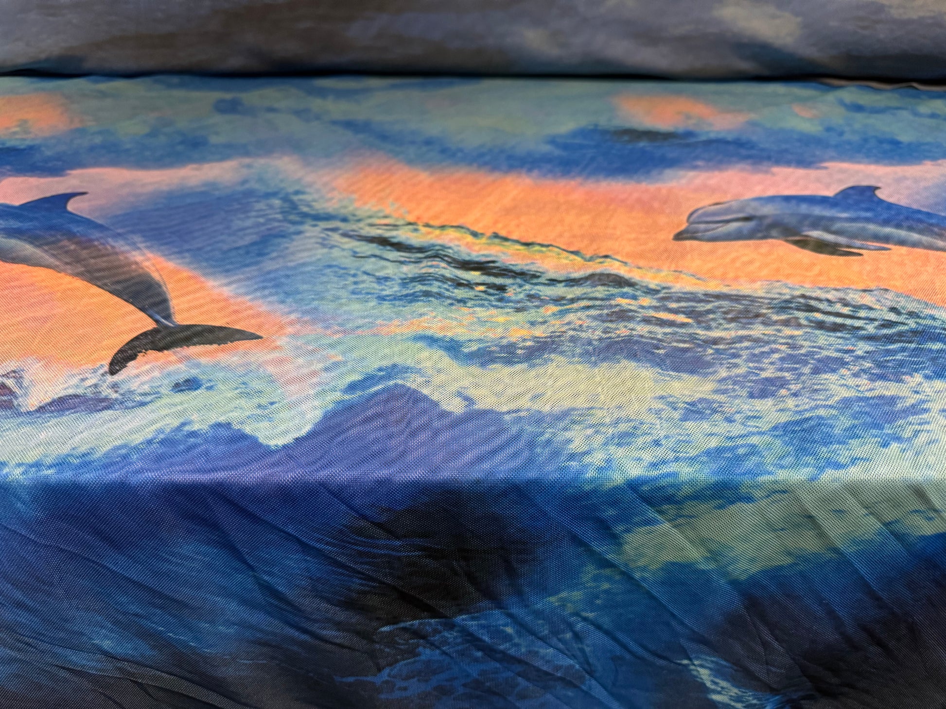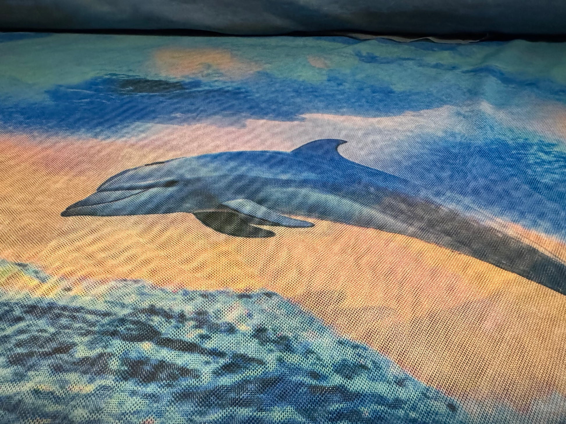Power mesh net stretch spandex fabric, per metre - dolphins print - blue & peach