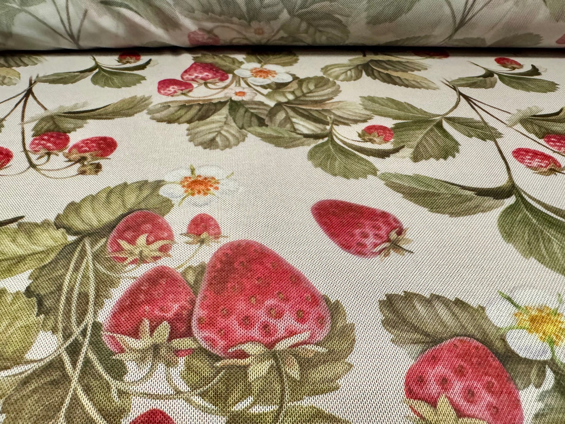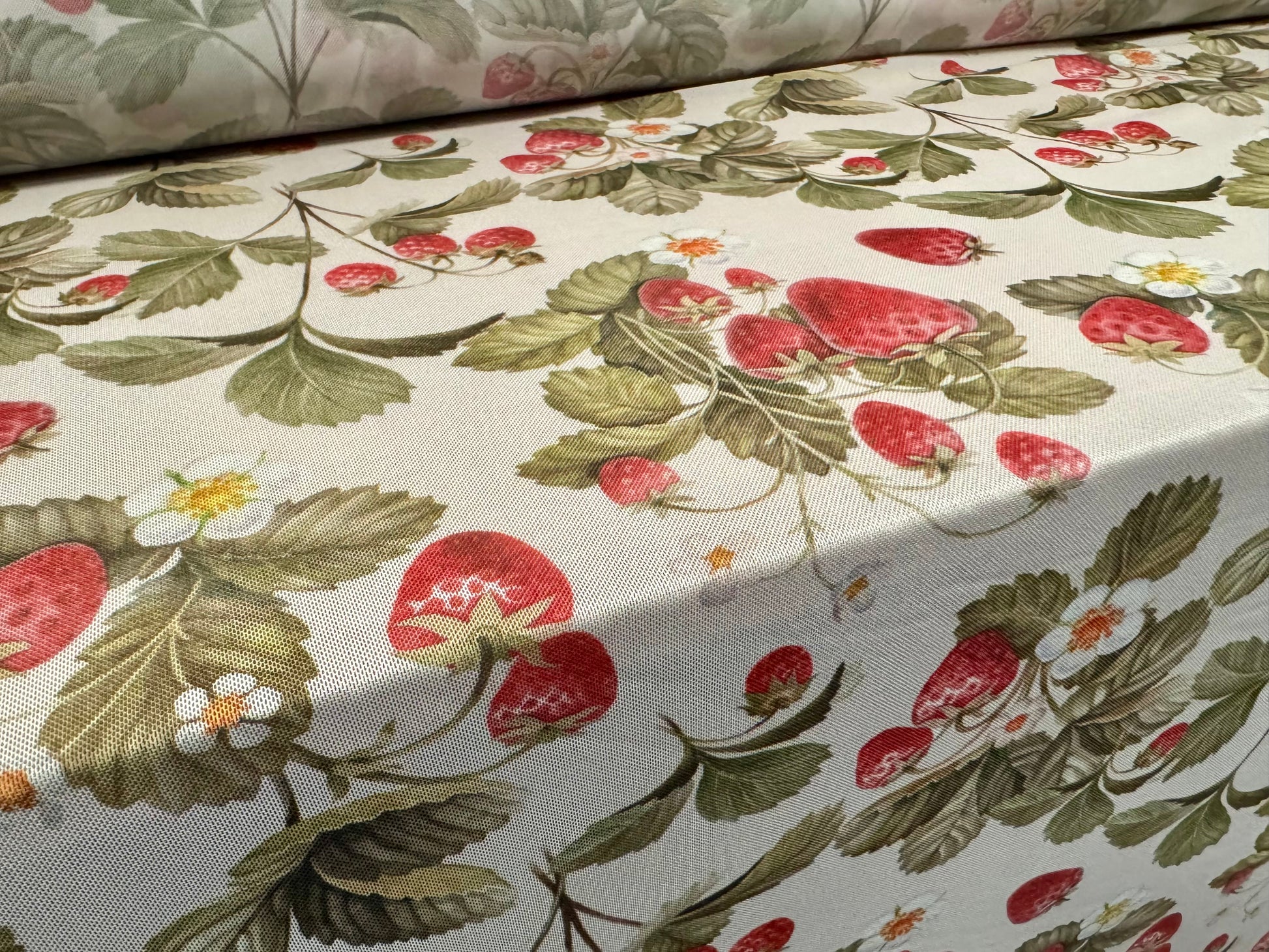 Power mesh net stretch spandex fabric, per metre - strawberries print - ecru green & red