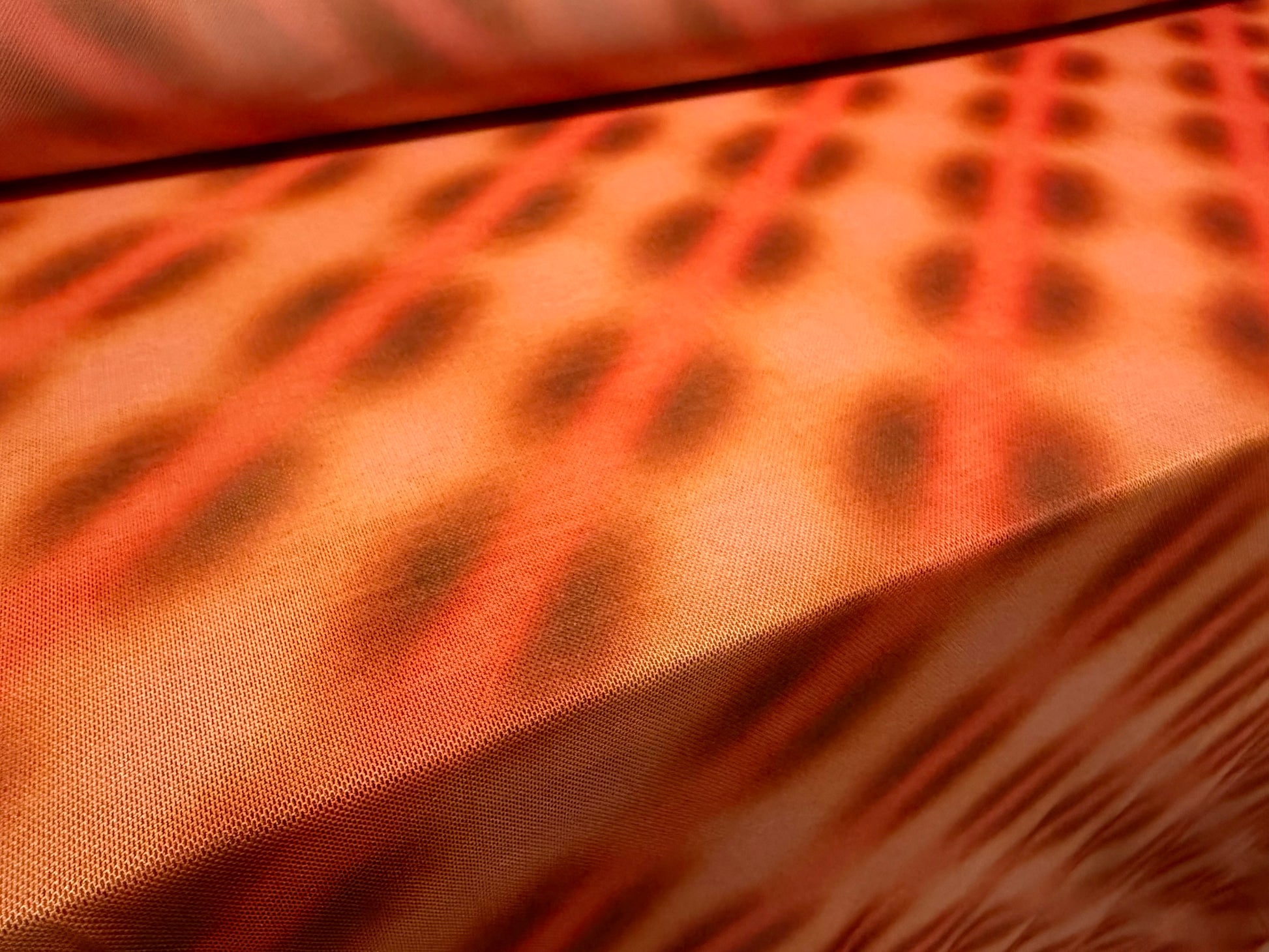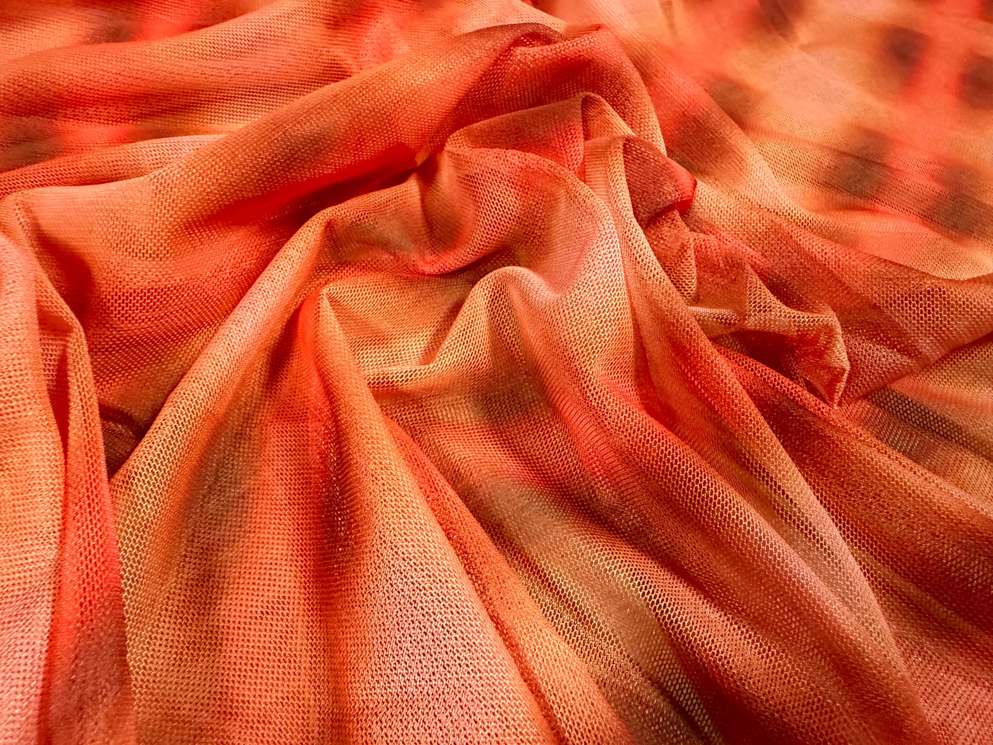 Power mesh net stretch spandex fabric, per metre - airbrushed abstract print - orange & peach