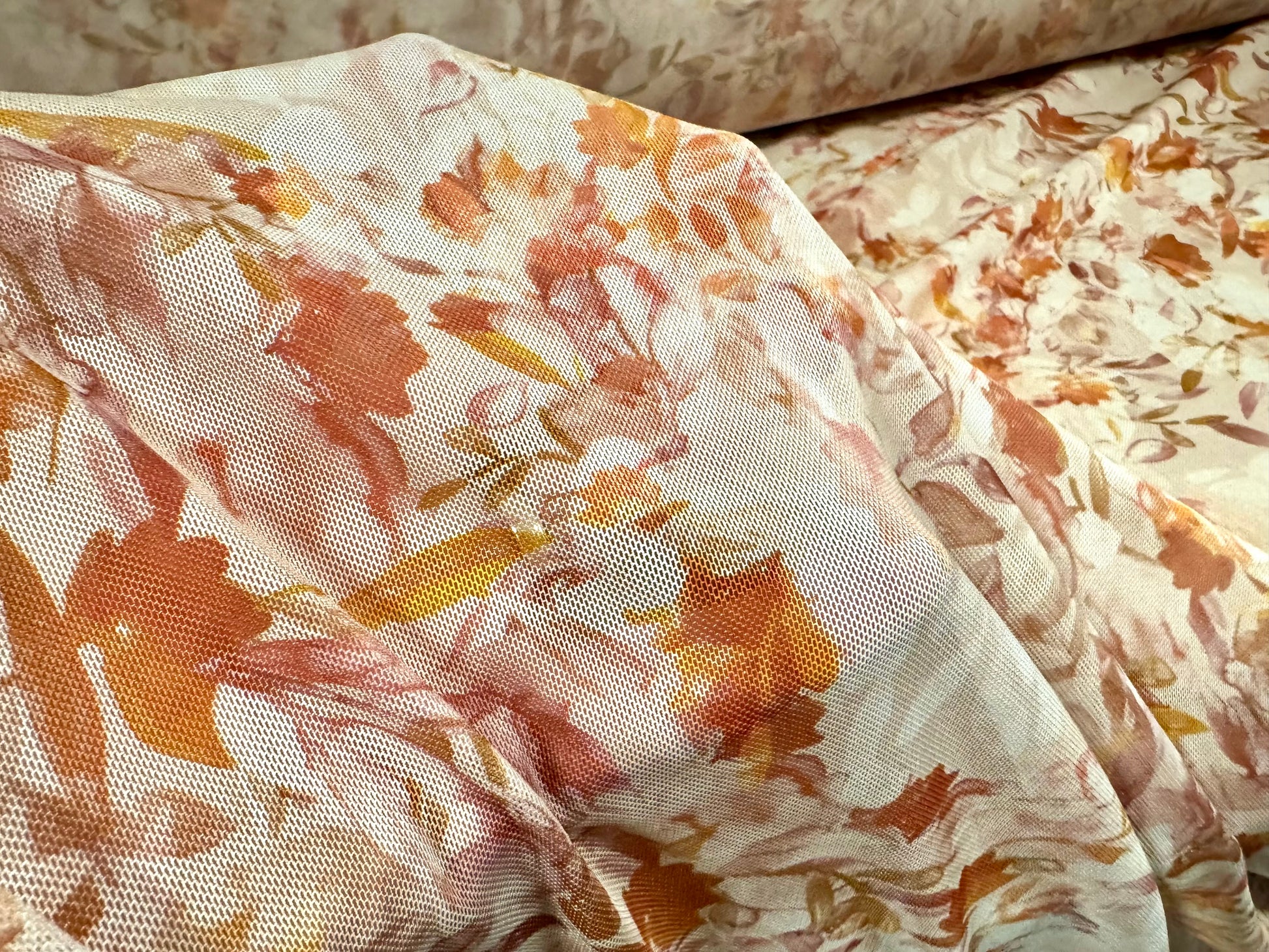Power mesh net stretch spandex fabric, per metre - floral print - cream & dusky pink