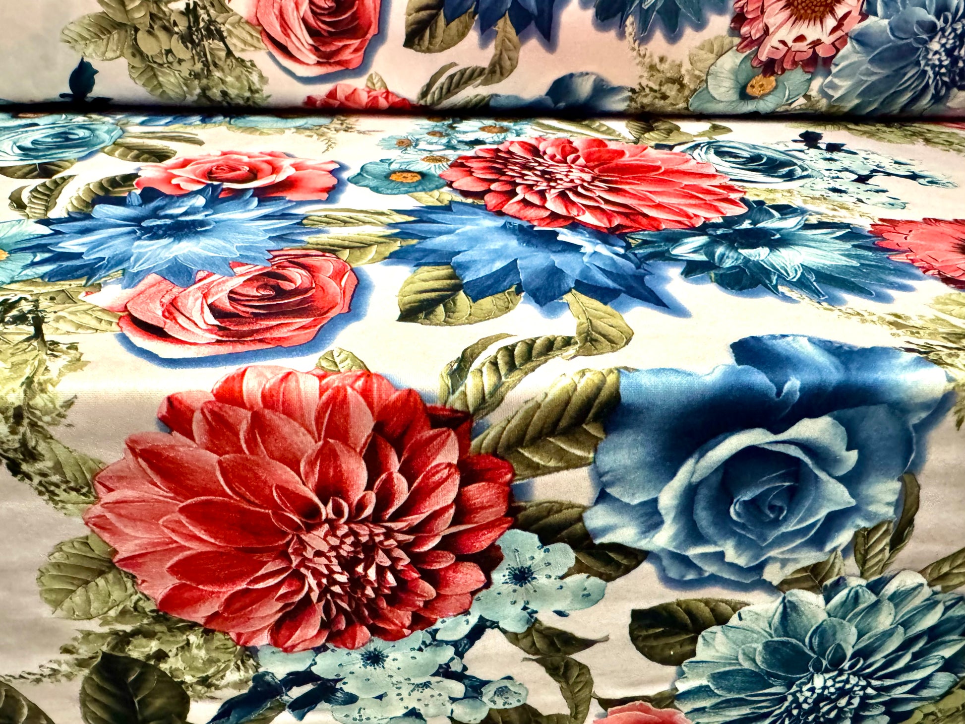 Scuba crepe-back stretch spandex jersey fabric, per metre - roses & carnations print - blush pink and blue