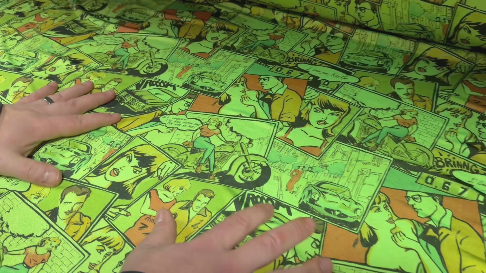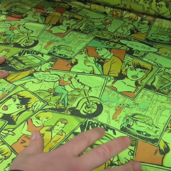 Stretch spandex single jersey fashion fabric, per metre - comic strip cartoon print - bright green