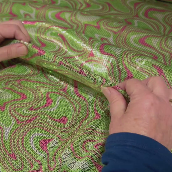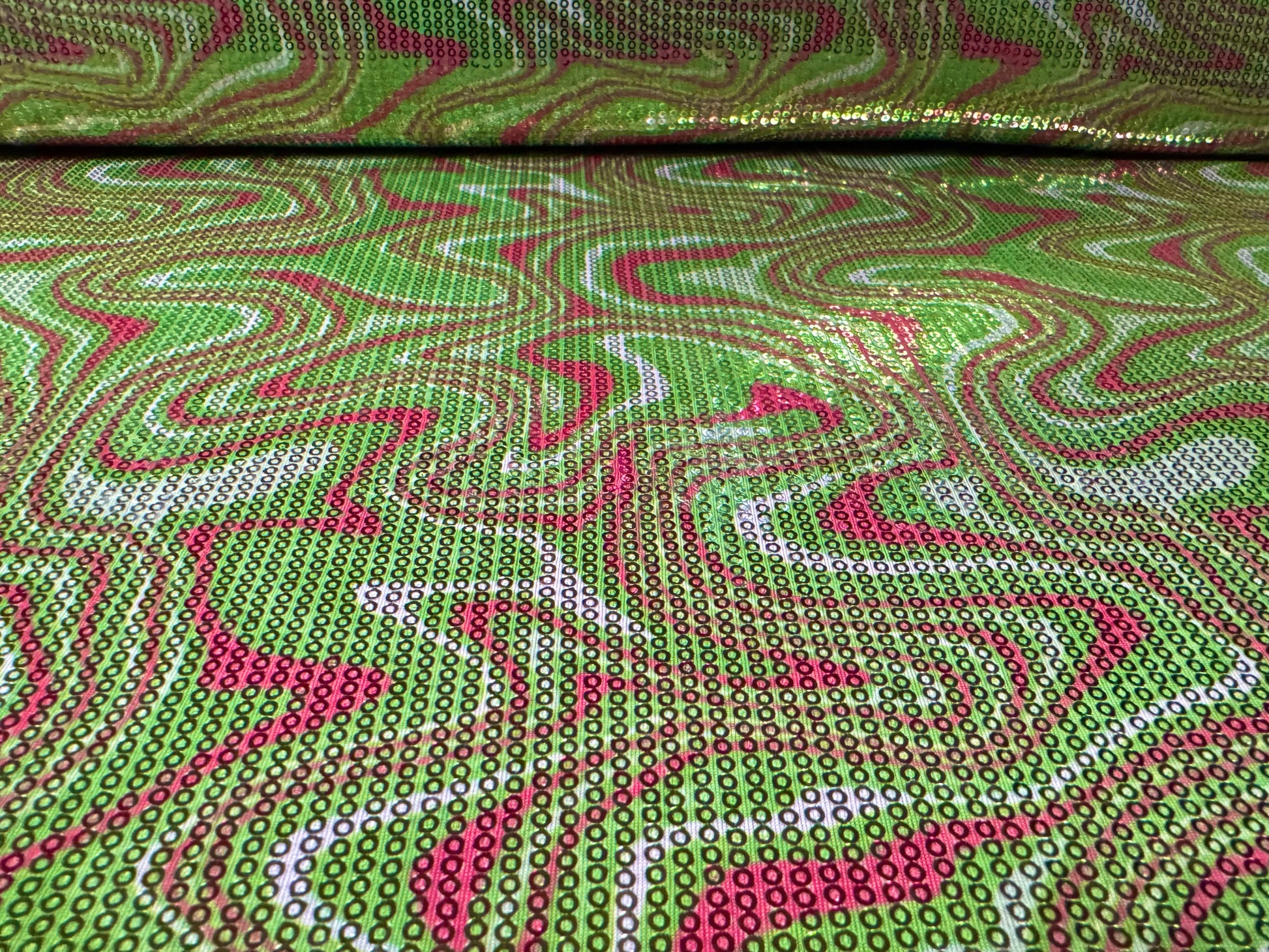 Couture dress fabric with sequins, per metre - swirl design - green & pink