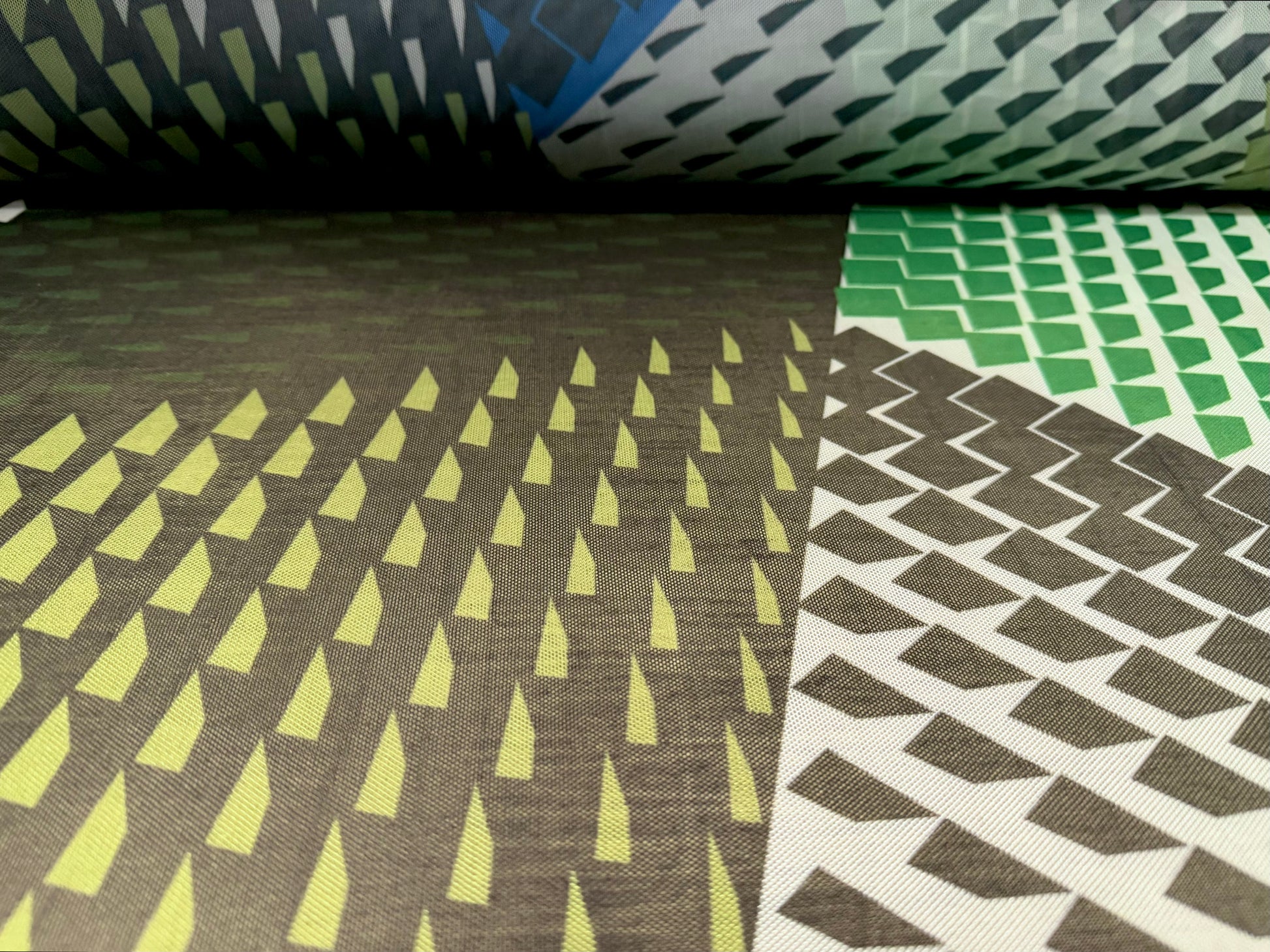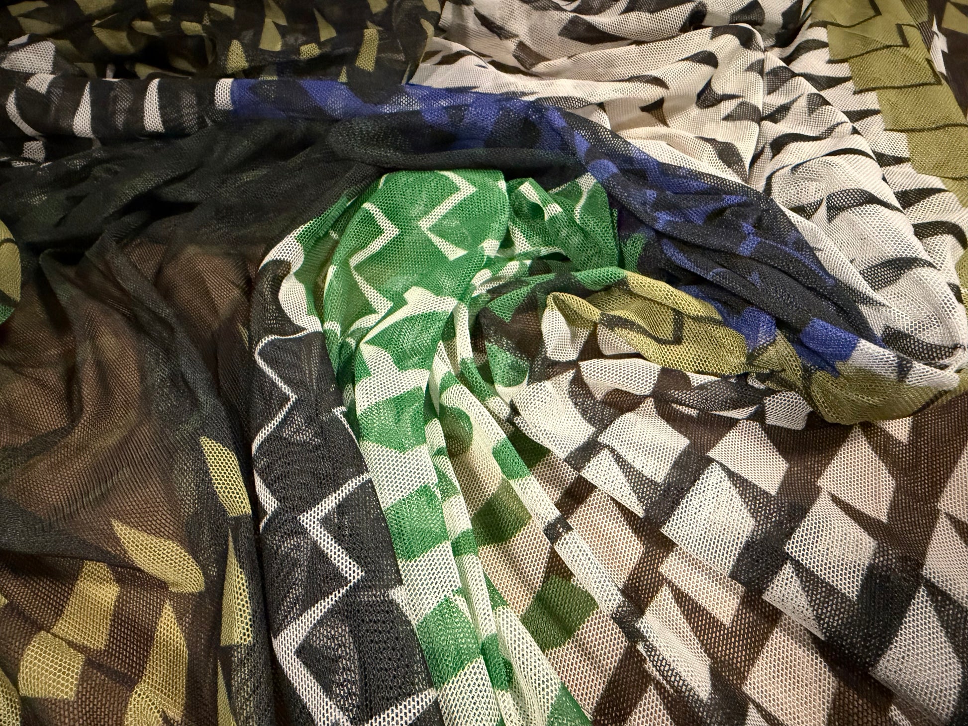 Power mesh net stretch spandex fabric, per metre - geometric print - khaki emerald & blue