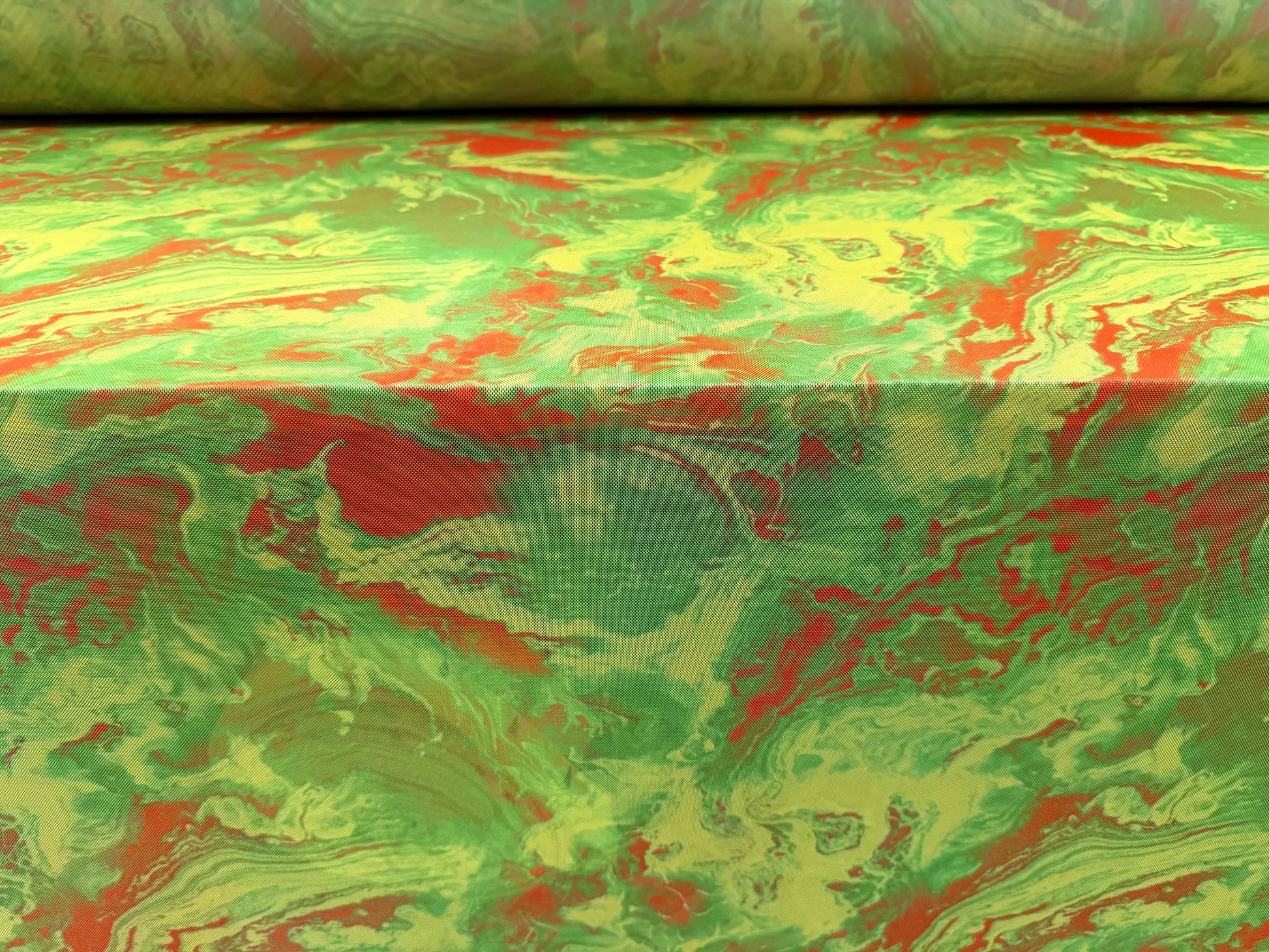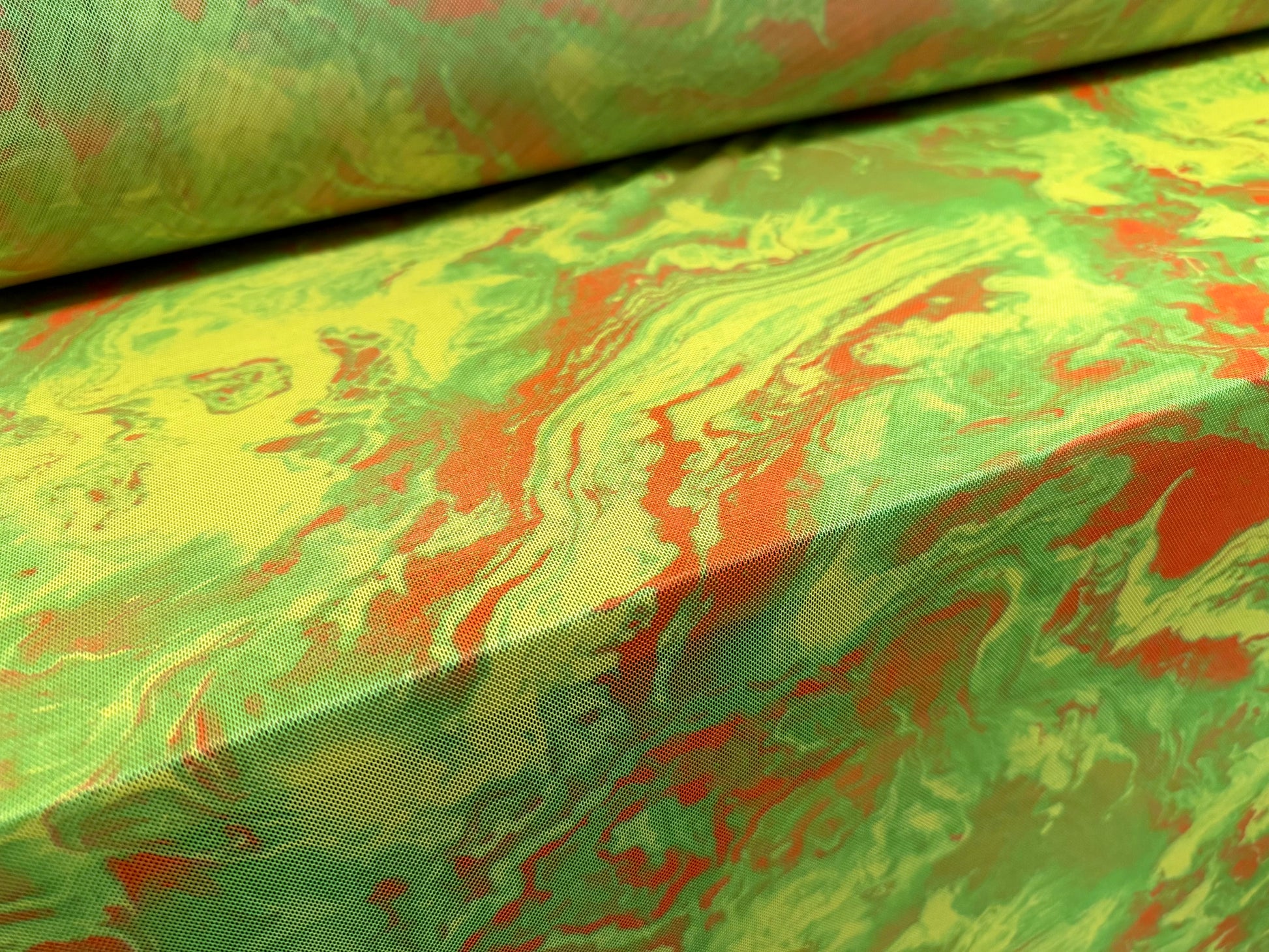Power mesh net stretch spandex fabric, per metre - abstract print - acid lime & orange
