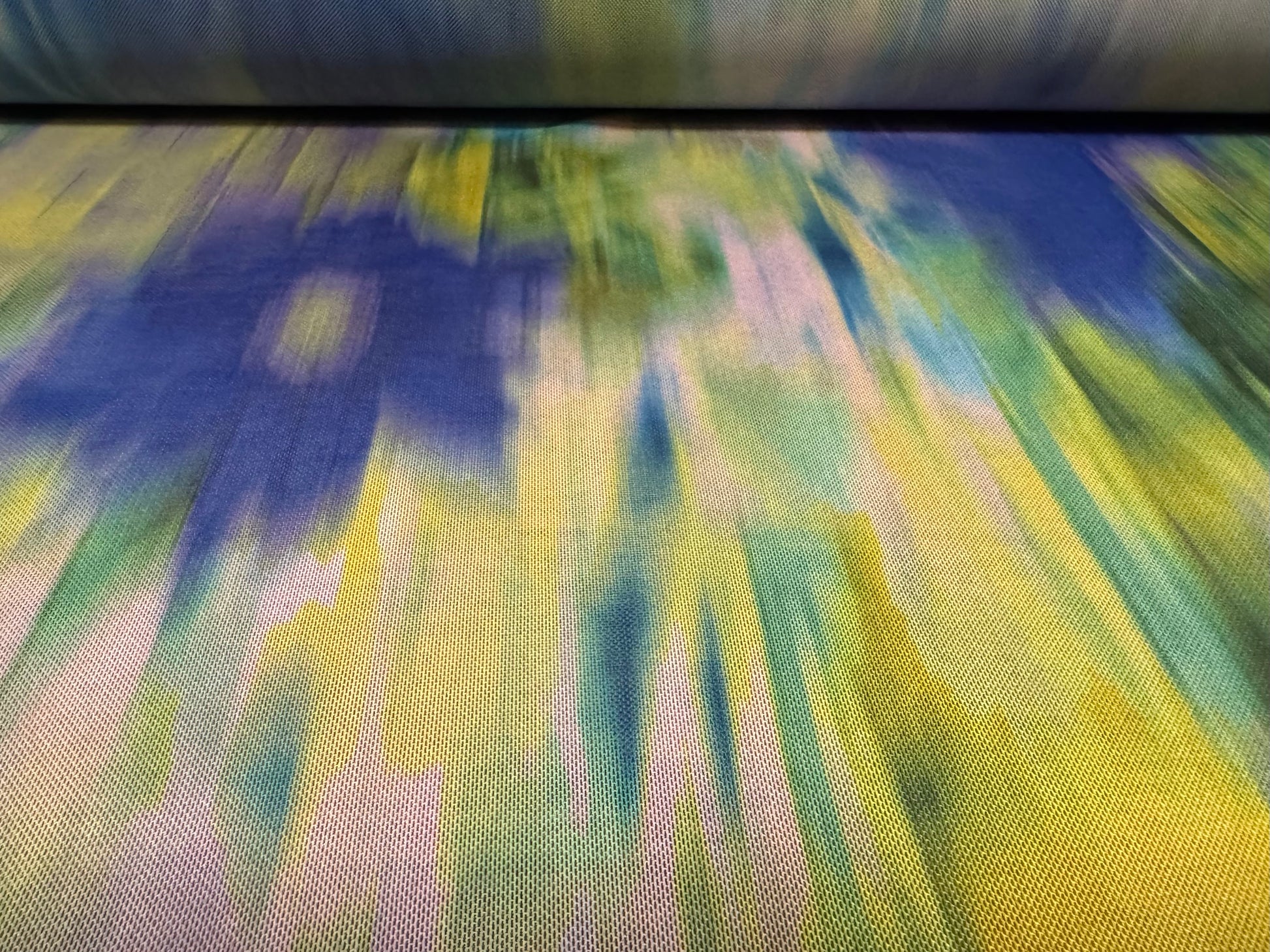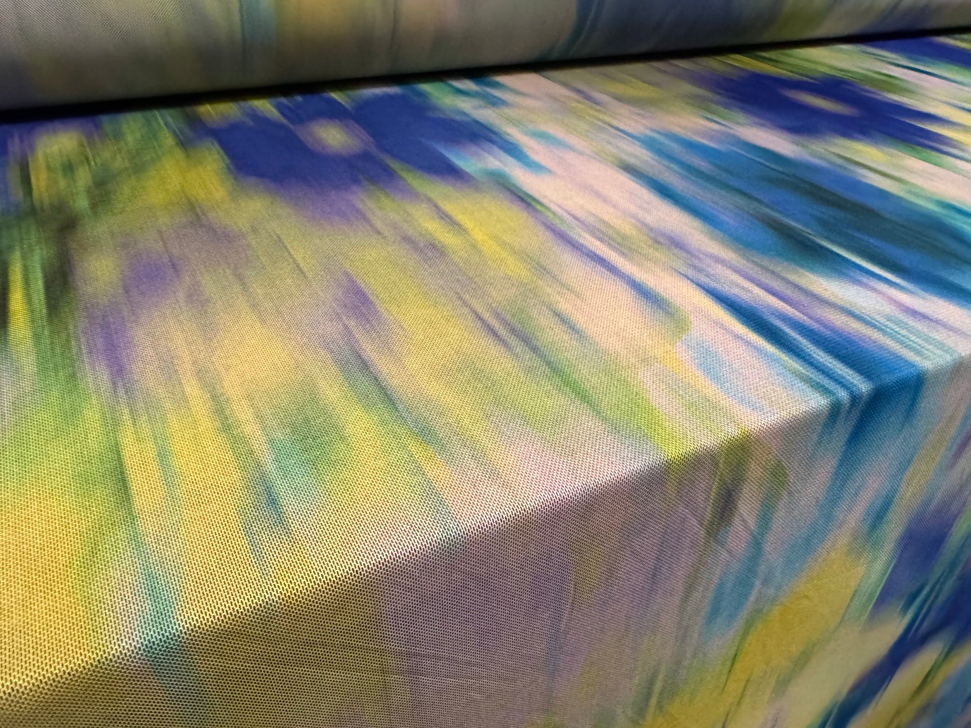 Power mesh net stretch spandex fabric, per metre - abstract print - yellow blue & lilac