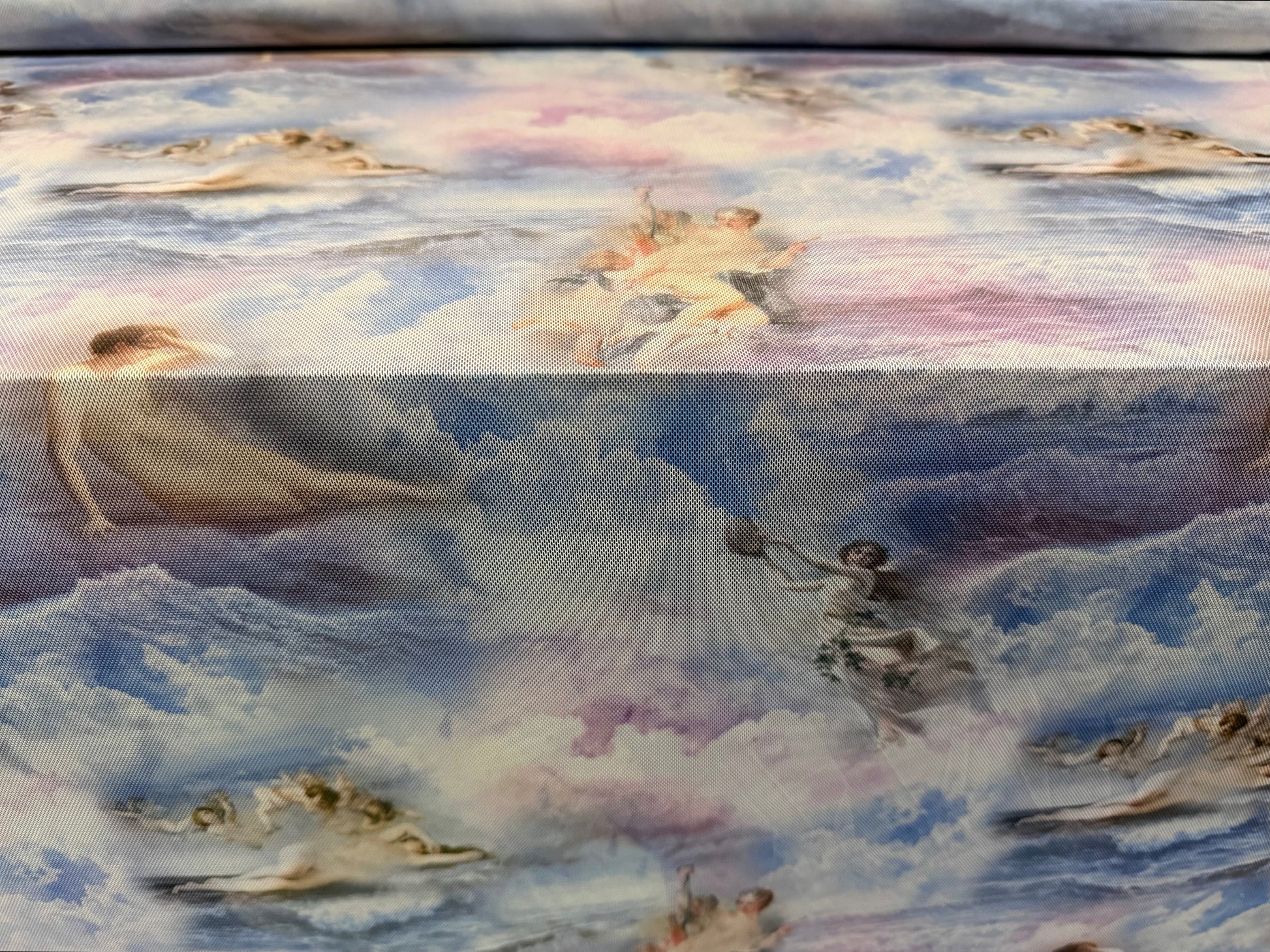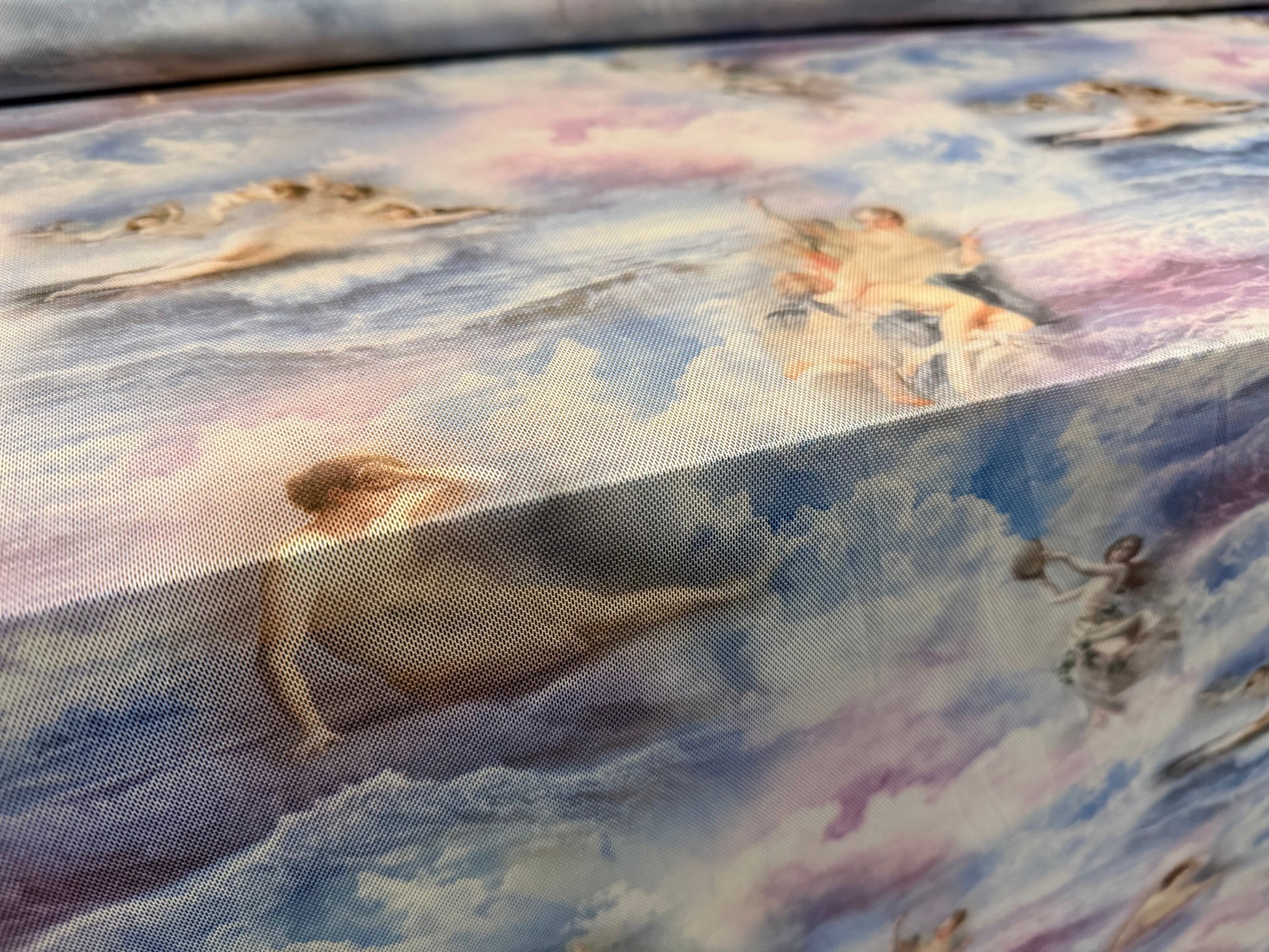 Power mesh net stretch spandex fabric, per metre - Heavenly Angels print - blue & lilac