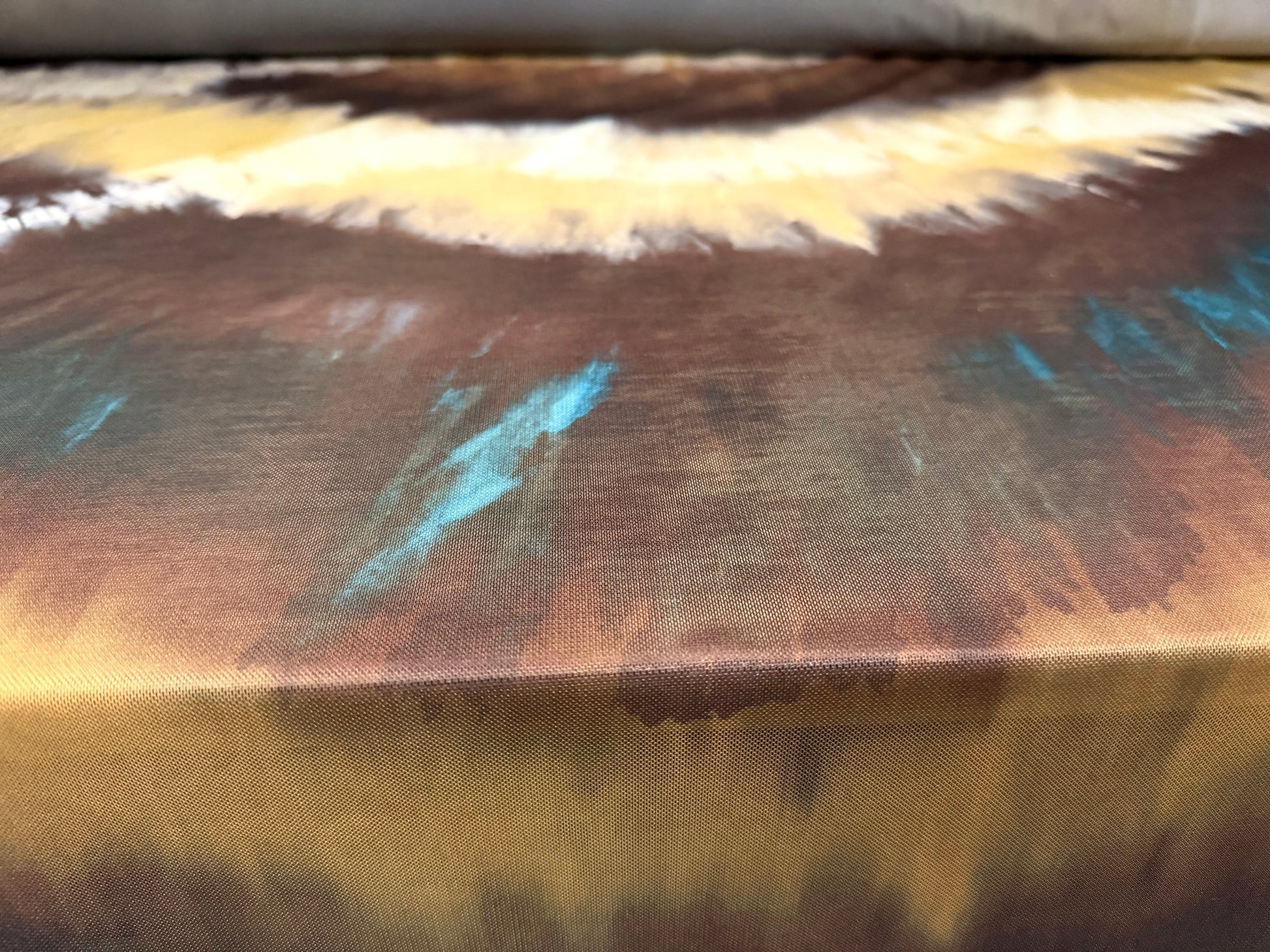 Power mesh net stretch spandex fabric, per metre - tie dye wave print - brown & mustard
