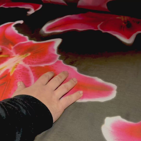 Power mesh net stretch spandex fabric, per metre - stargazer lily print - black & cerise pink