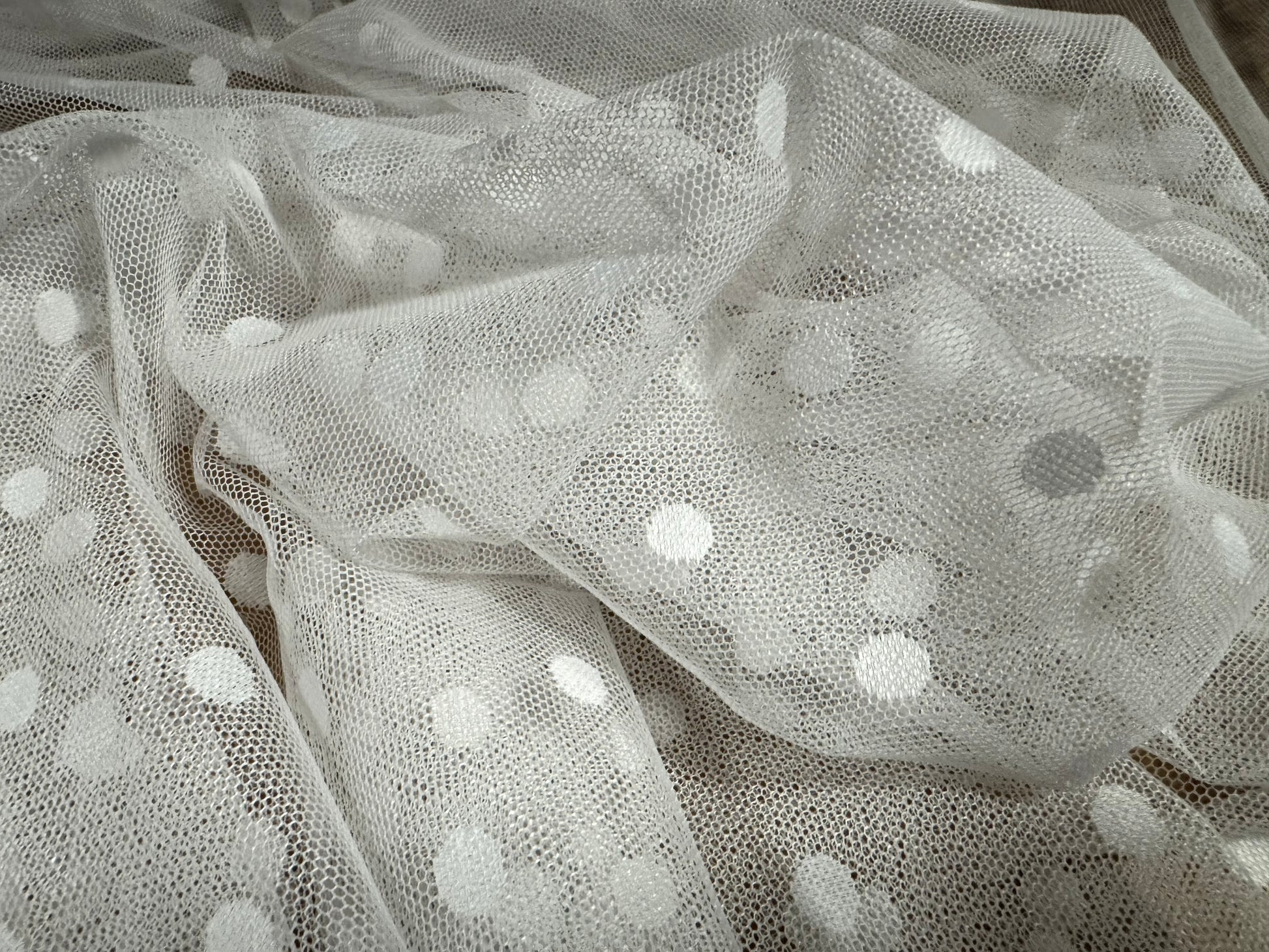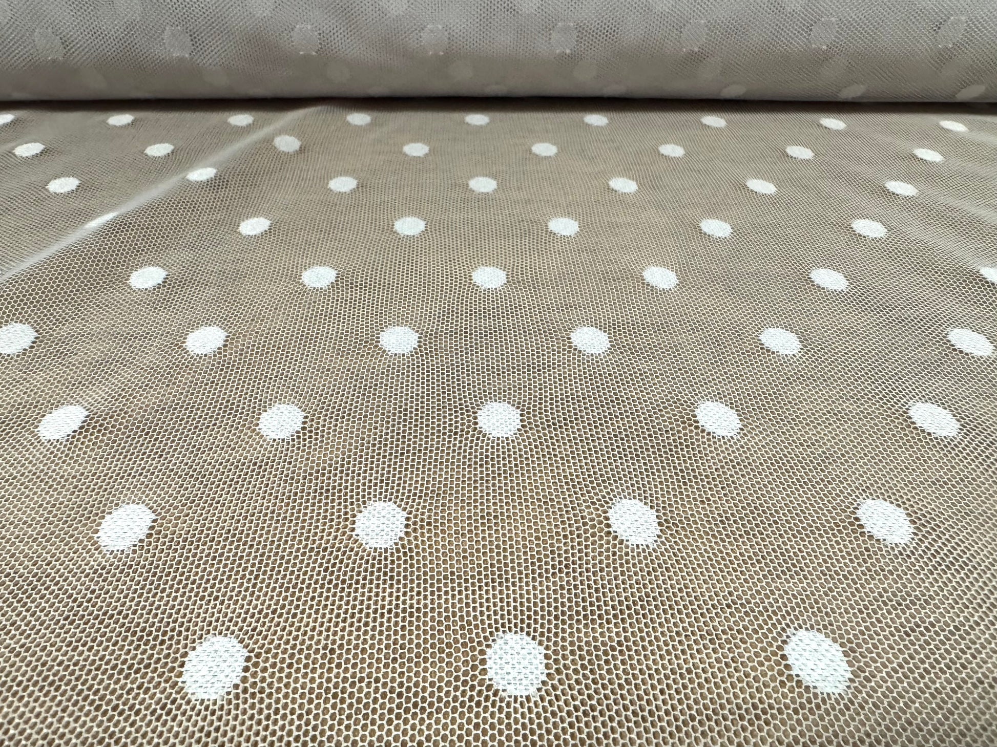 Stretch spandex mesh net fabric, per metre - polka dot - white on white
