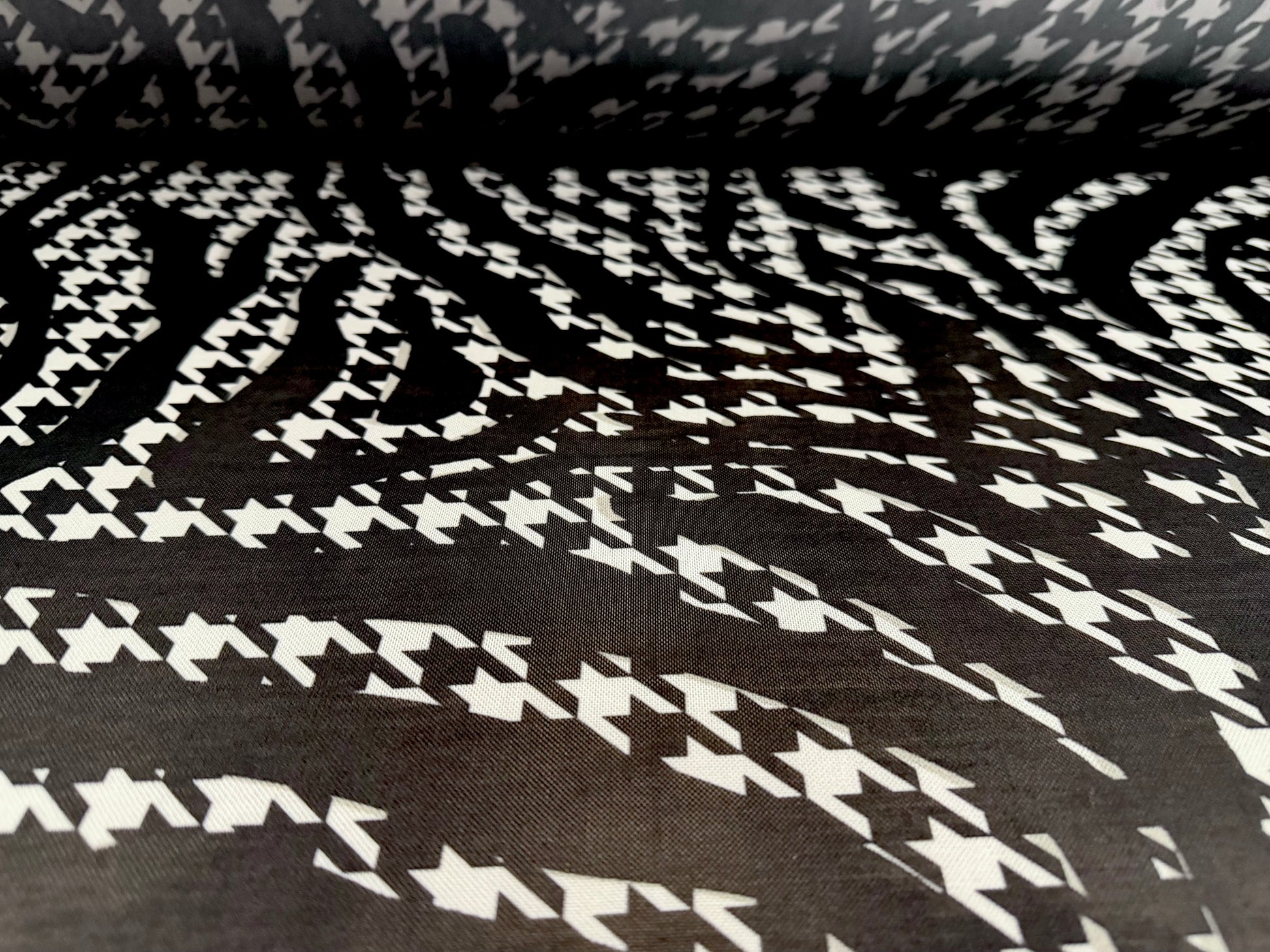 Power mesh net stretch spandex fabric, per metre - houndstooth swirl print - black & white