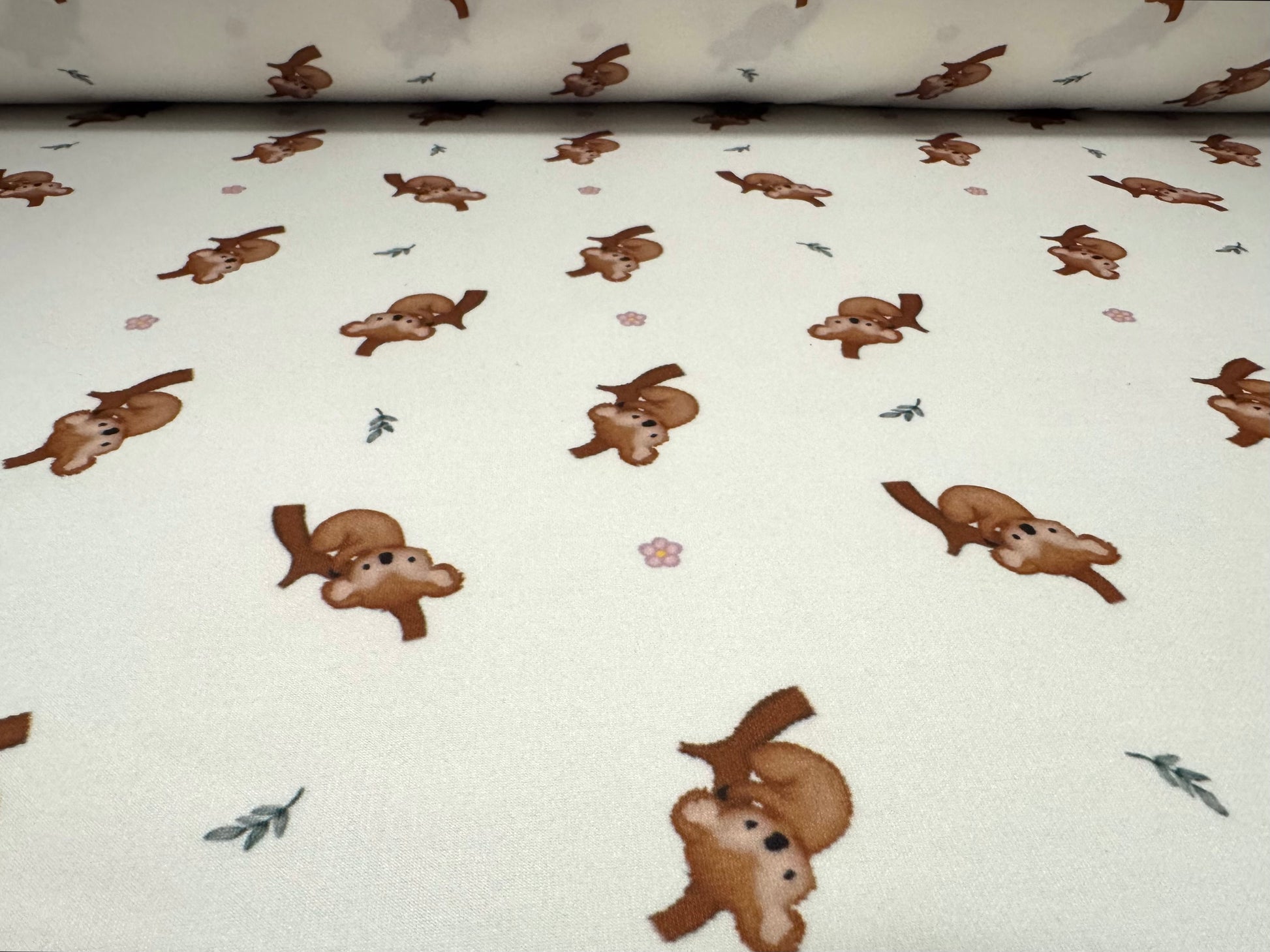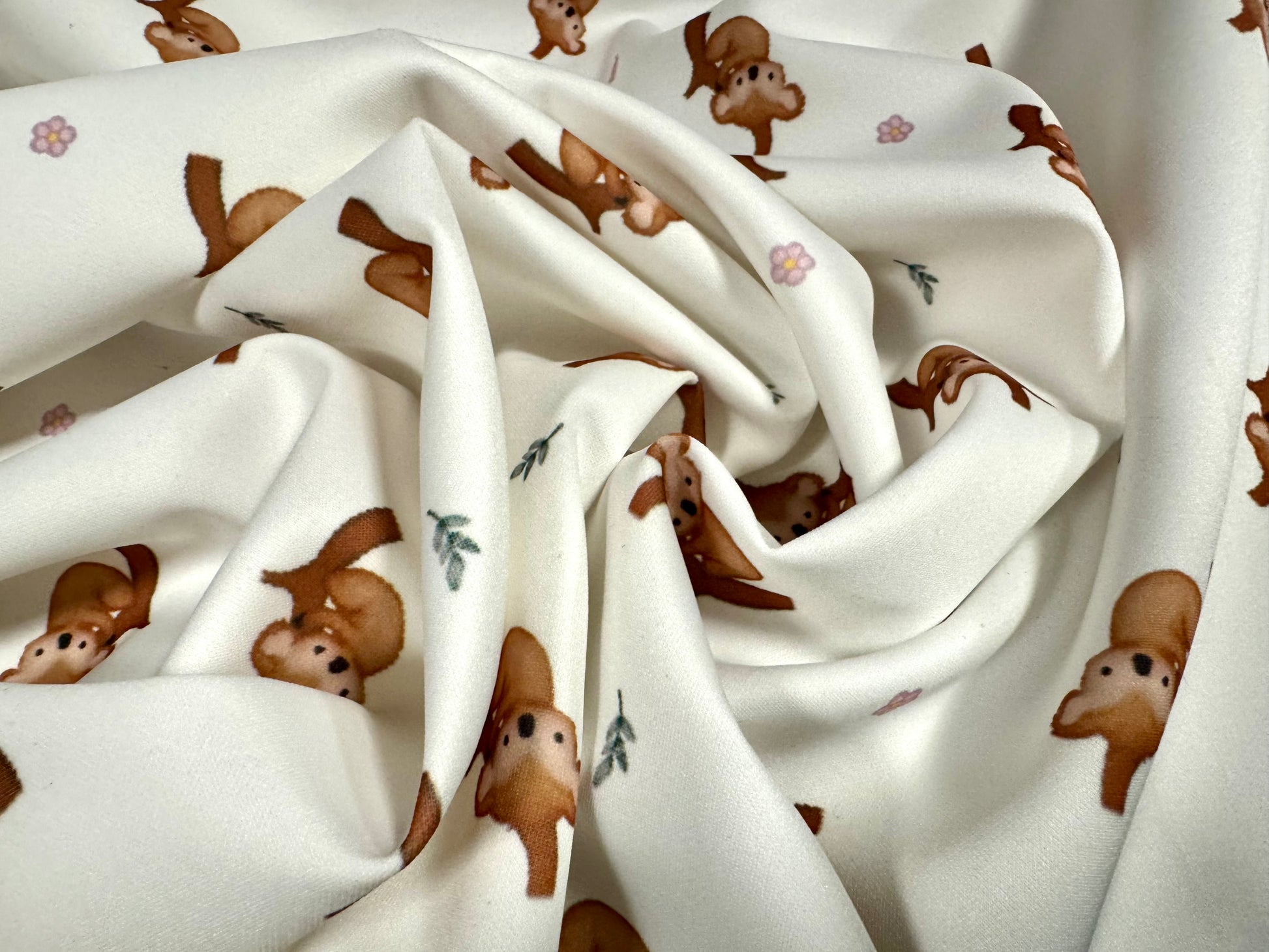 Scuba stretch spandex double jersey fabric, per metre - koala bear print - white & brown