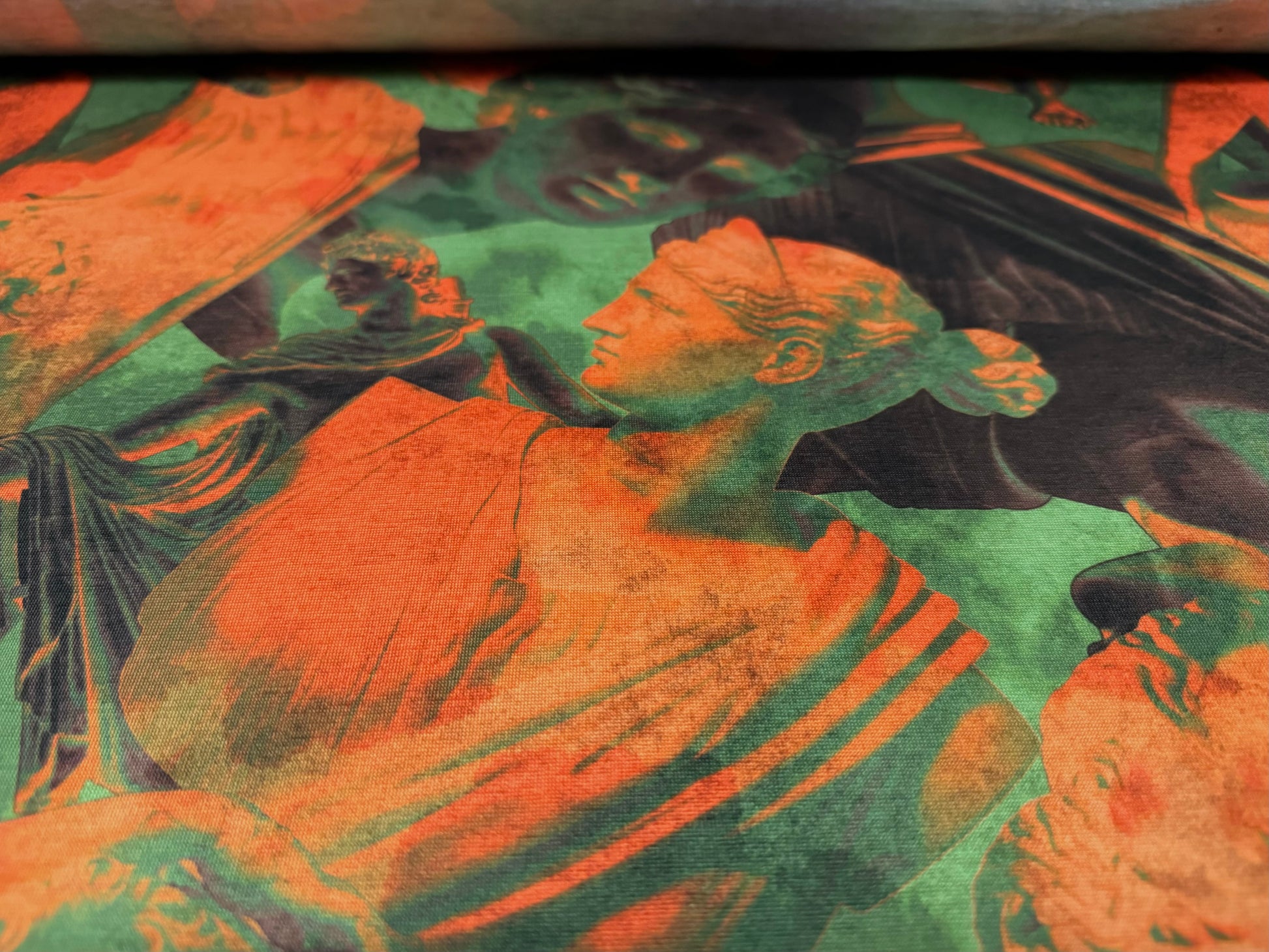 Soft handle stretch single jersey fashion fabric, per metre - Greek Goddess print - orange & green