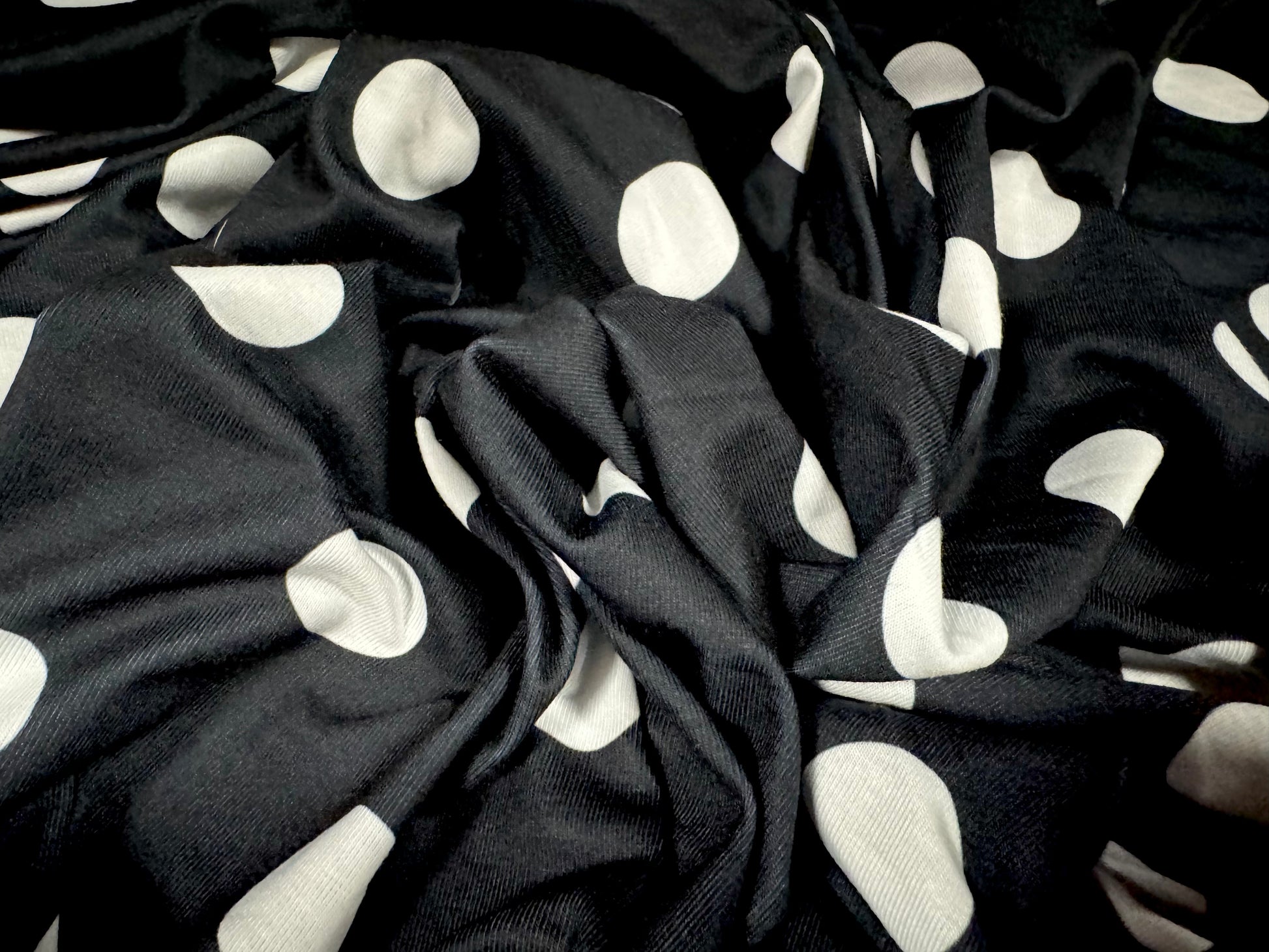 Soft handle stretch single jersey fashion fabric, per metre - polka dot print - black & white