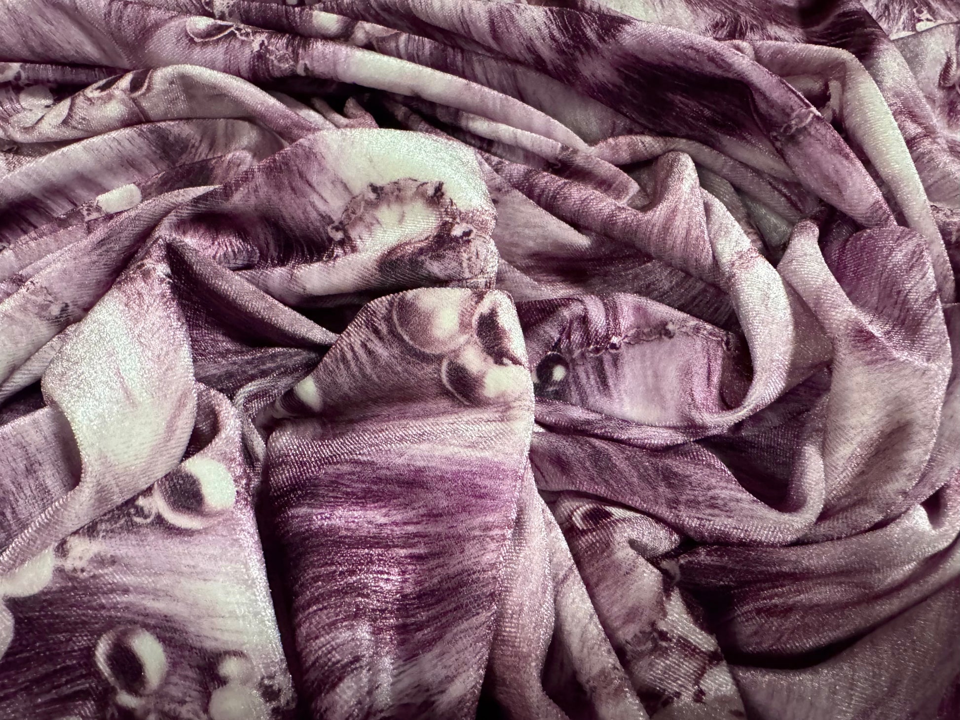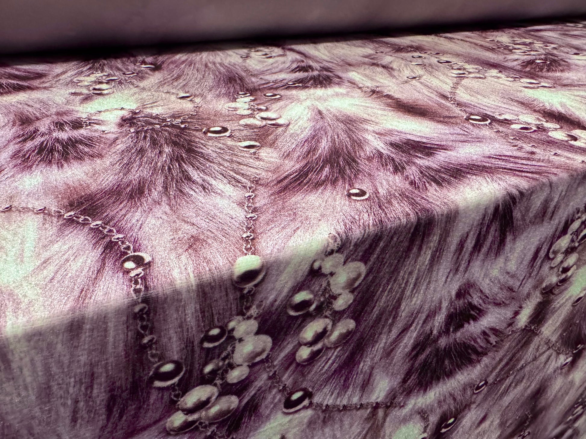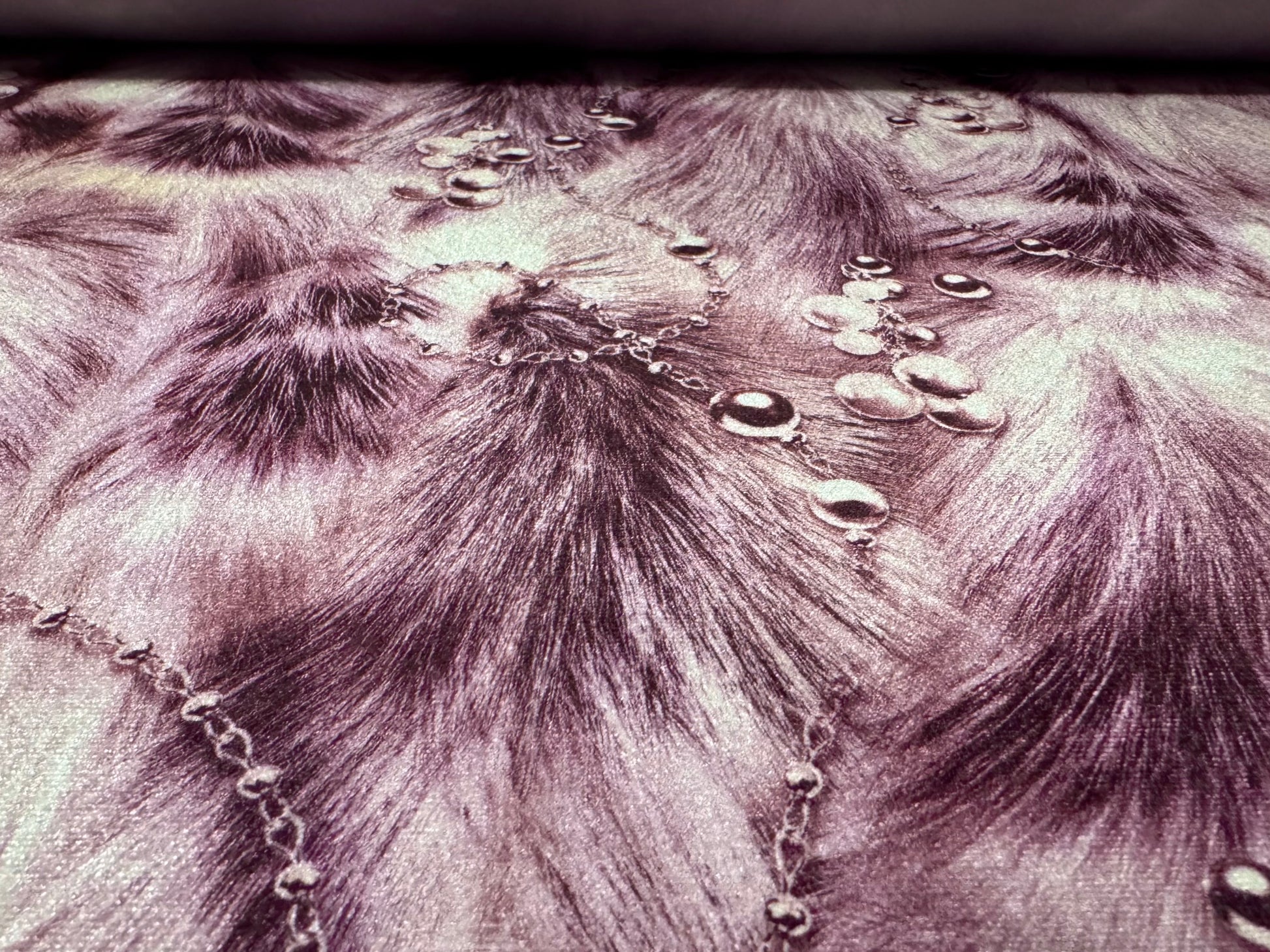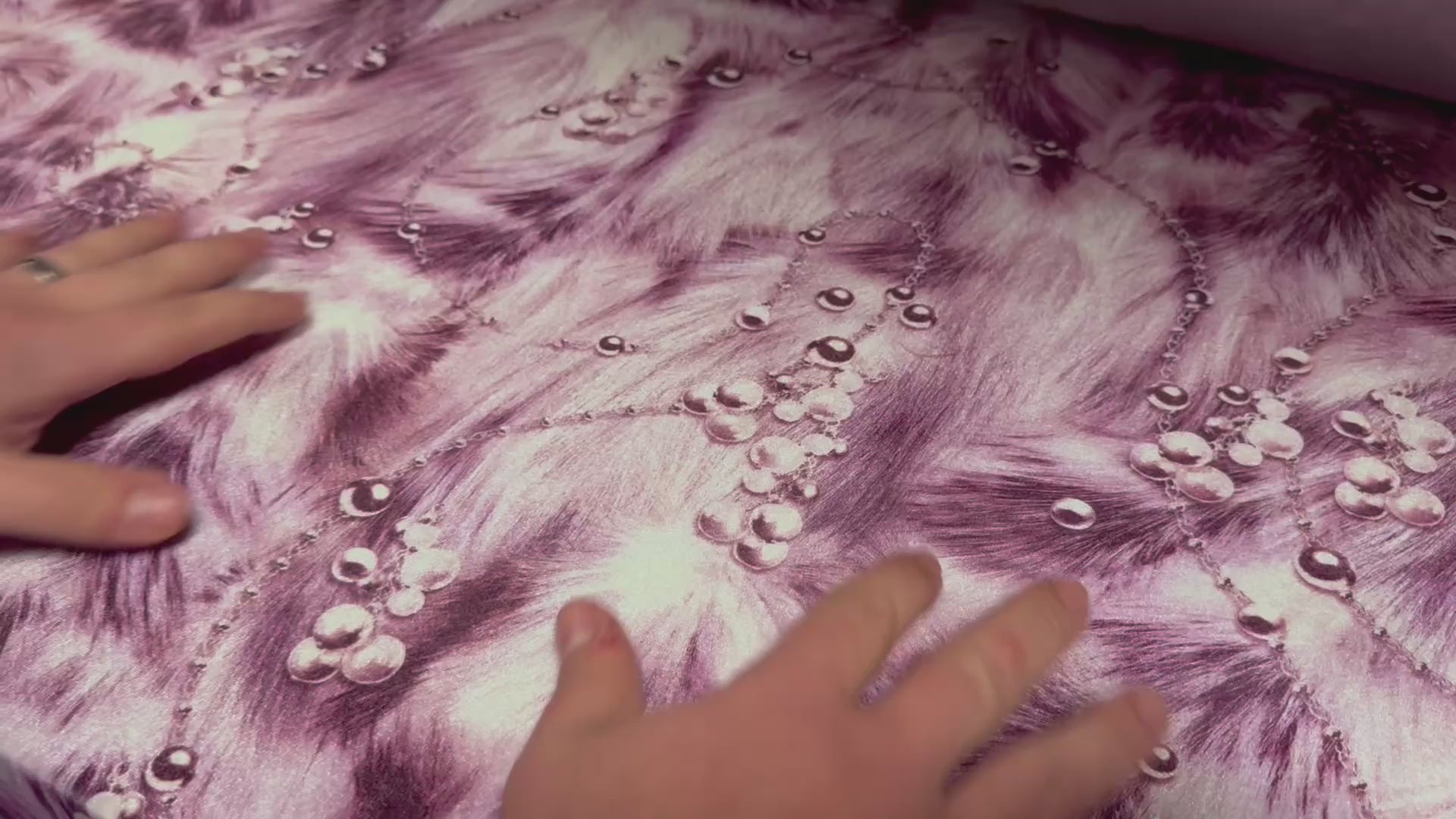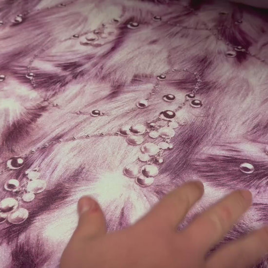 Spandex velvet stretch dress fabric, per metre - pearls on fur print - purple
