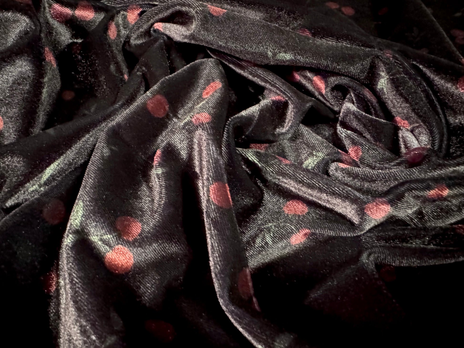 Spandex velvet stretch dress fabric, per metre - cherry print - black & dark red