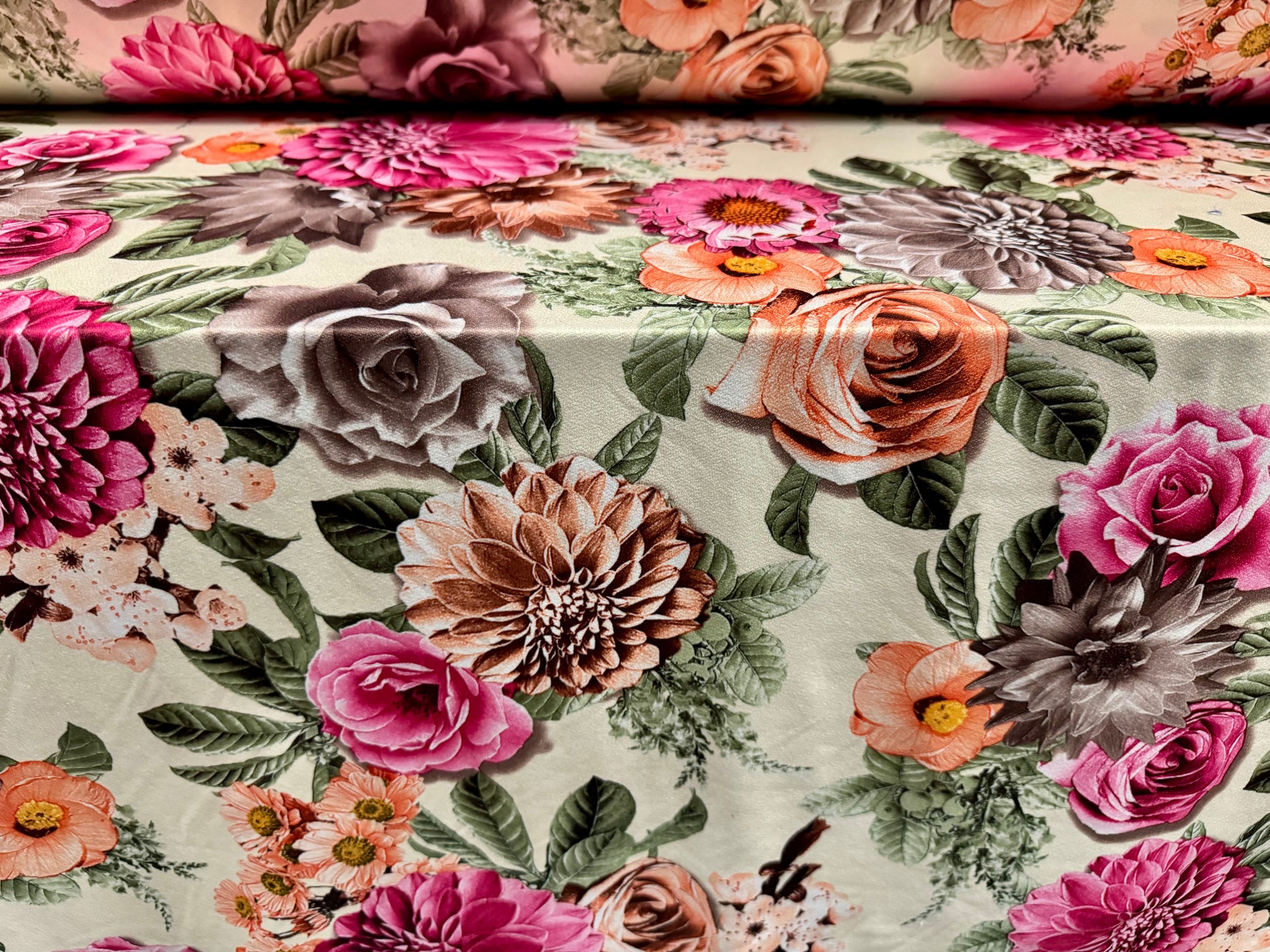 Stretch spandex crepe single jersey dress fabric, per metre - carnations and roses print - pistachio cream & pink