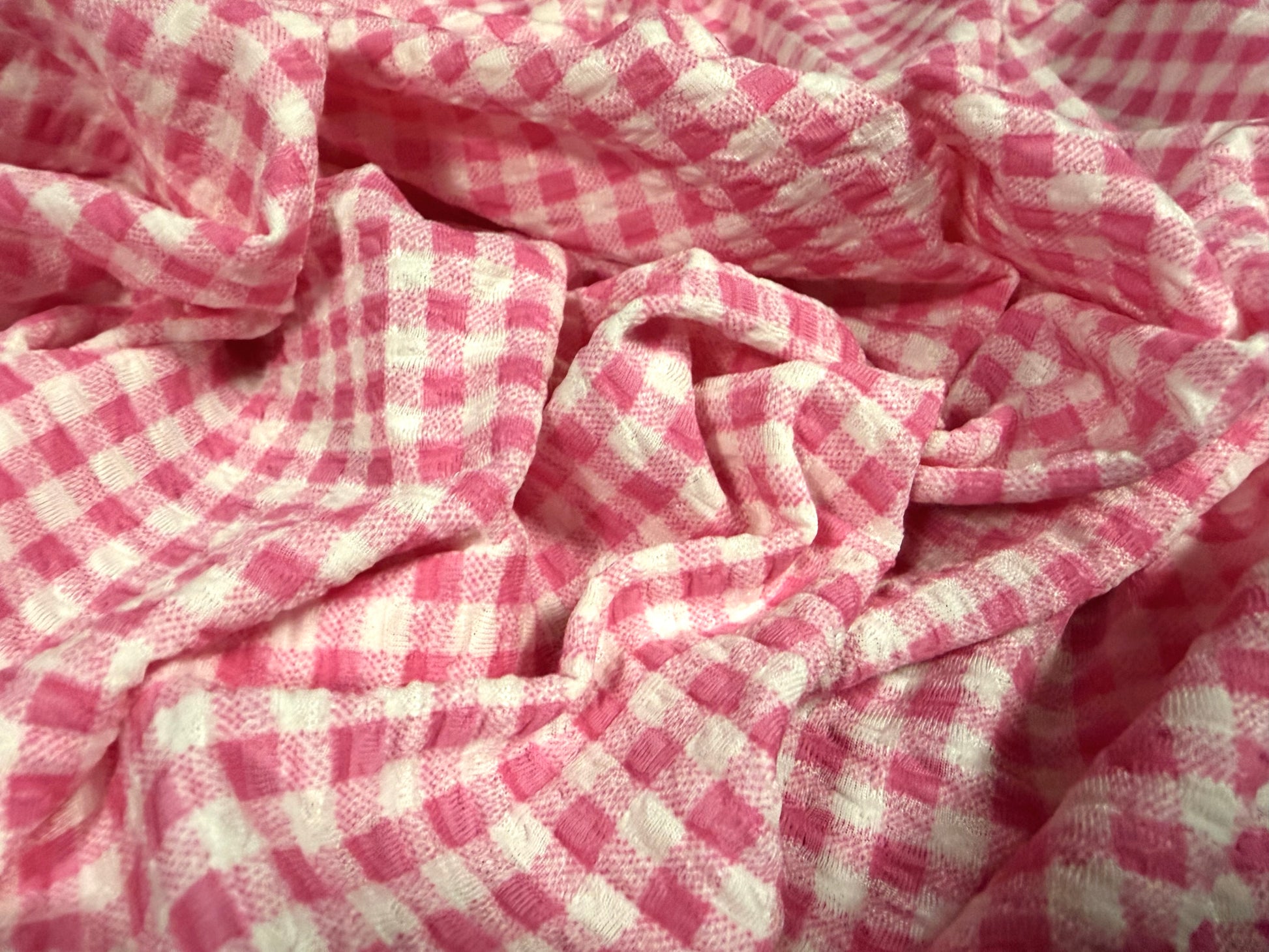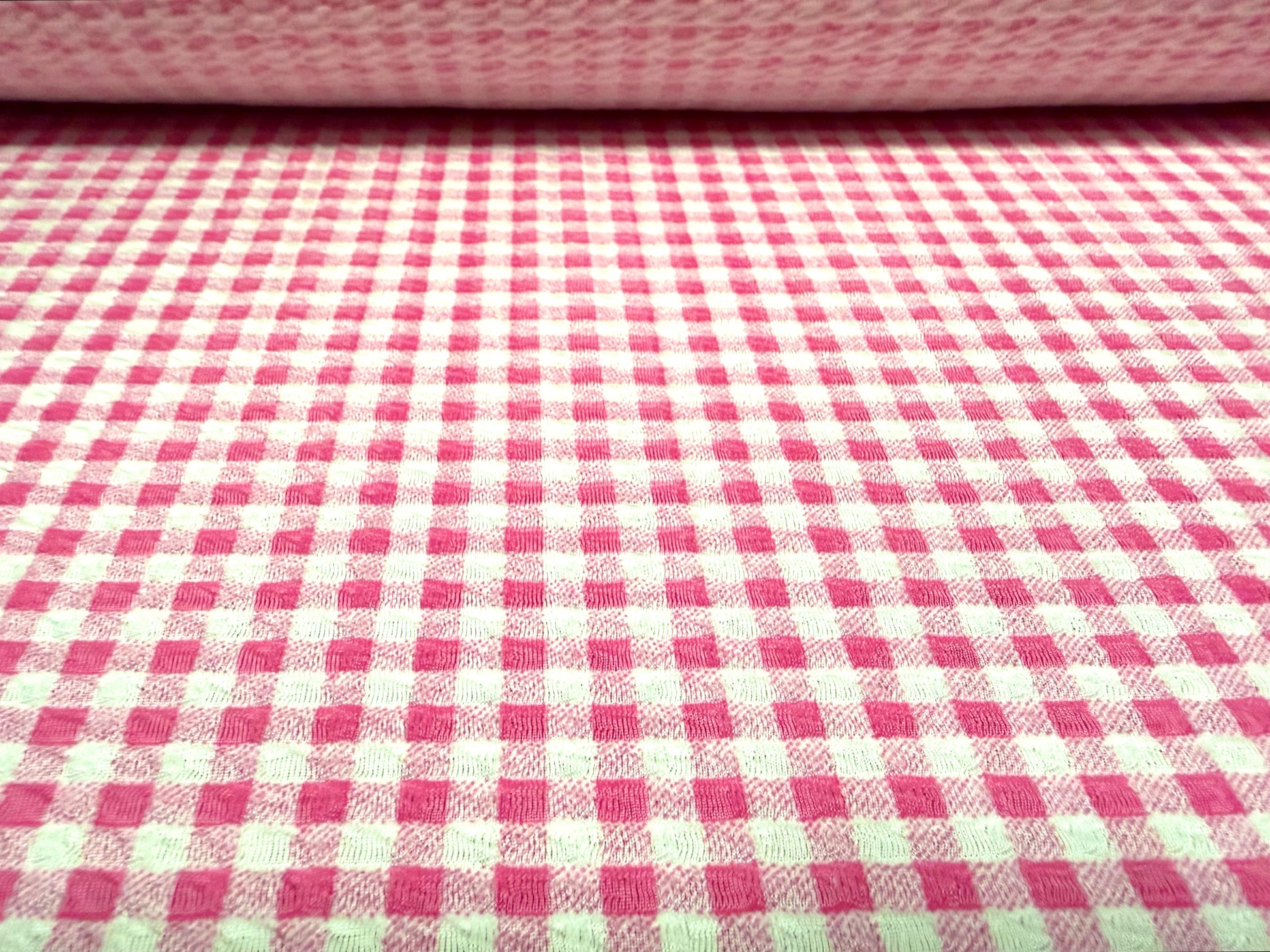 Stretch spandex jersey jacquard fabric, per metre - gingham print - pink & white