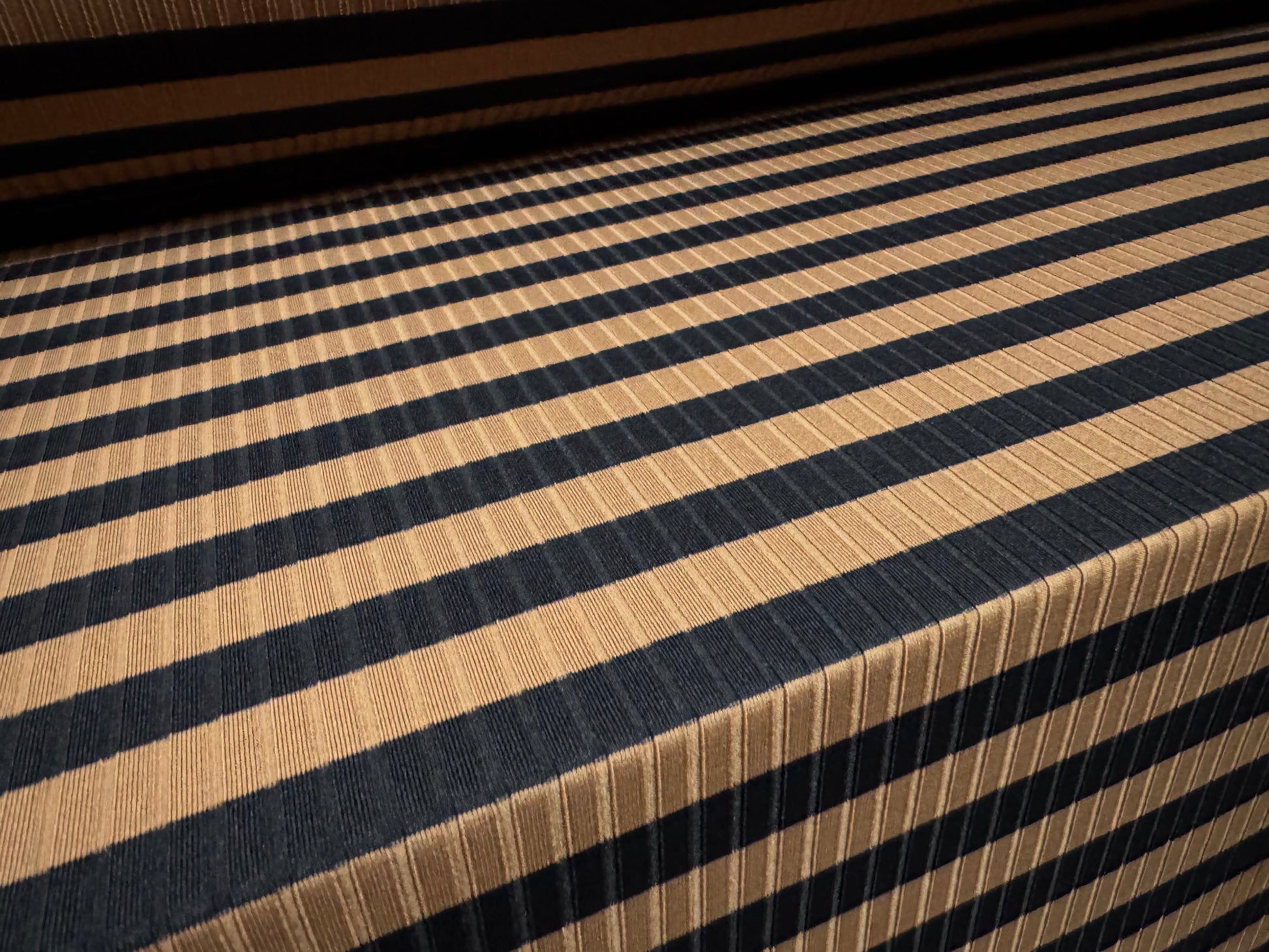 Spandex rib stretch jersey fabric. 95% polyester 5% spandex. Soft & stretchy with a width of 130 cms. This is an engineered stripe - the yarns are dyed their respective colours and then combined when knitting to create the stripe pattern, as opposed to printing. 4 way stretch.