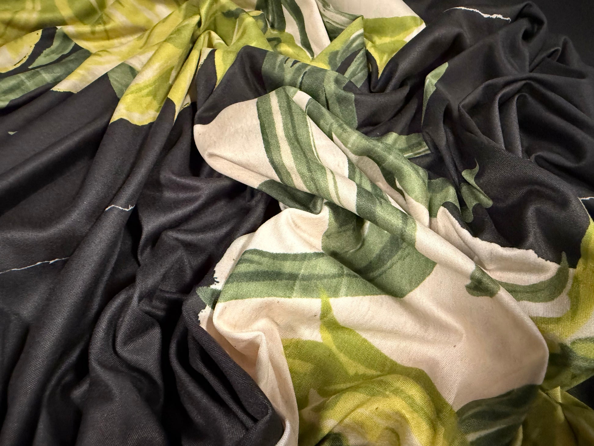 Super soft stretch single jersey fabric, per metre - lily floral print - black cream & green