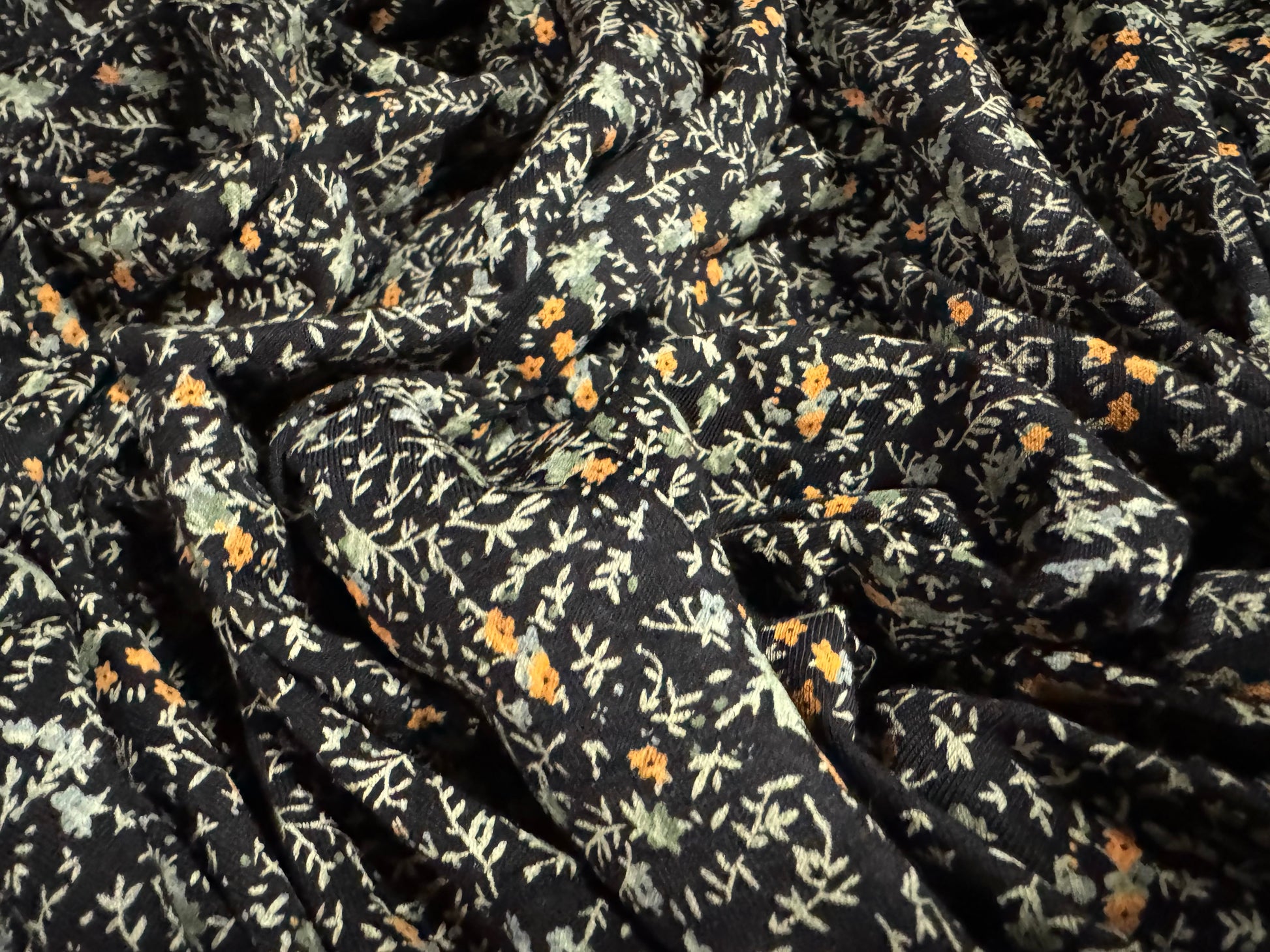 Viscose spandex stretch single jersey fabric, per metre - small ditsy flower print - black sage & orange