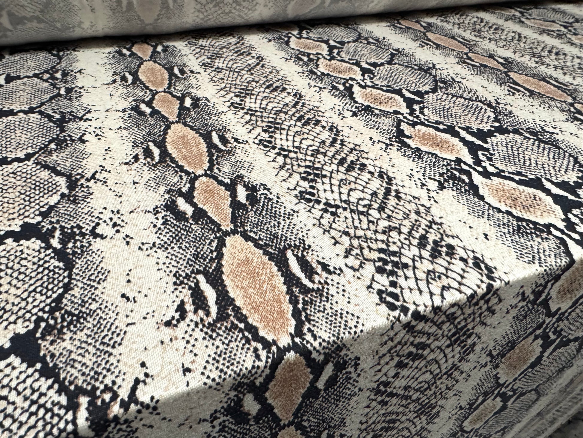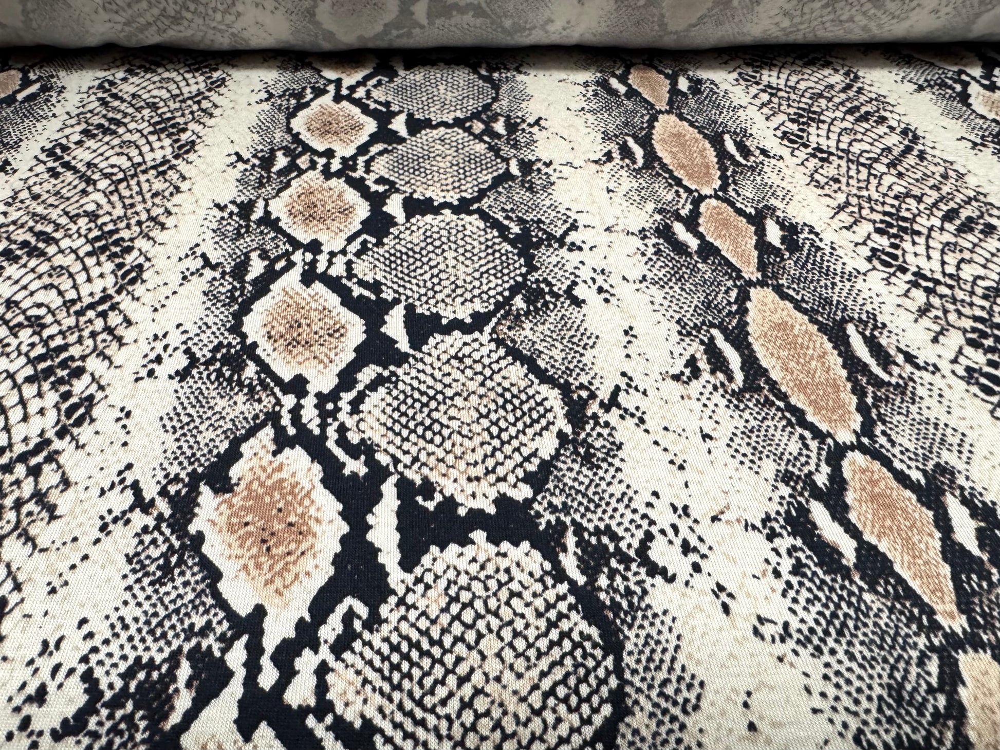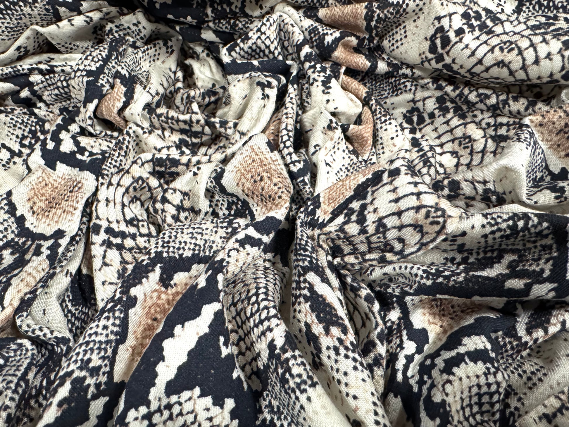 Viscose spandex stretch single jersey fabric, per metre - snakeskin print - cream & beige